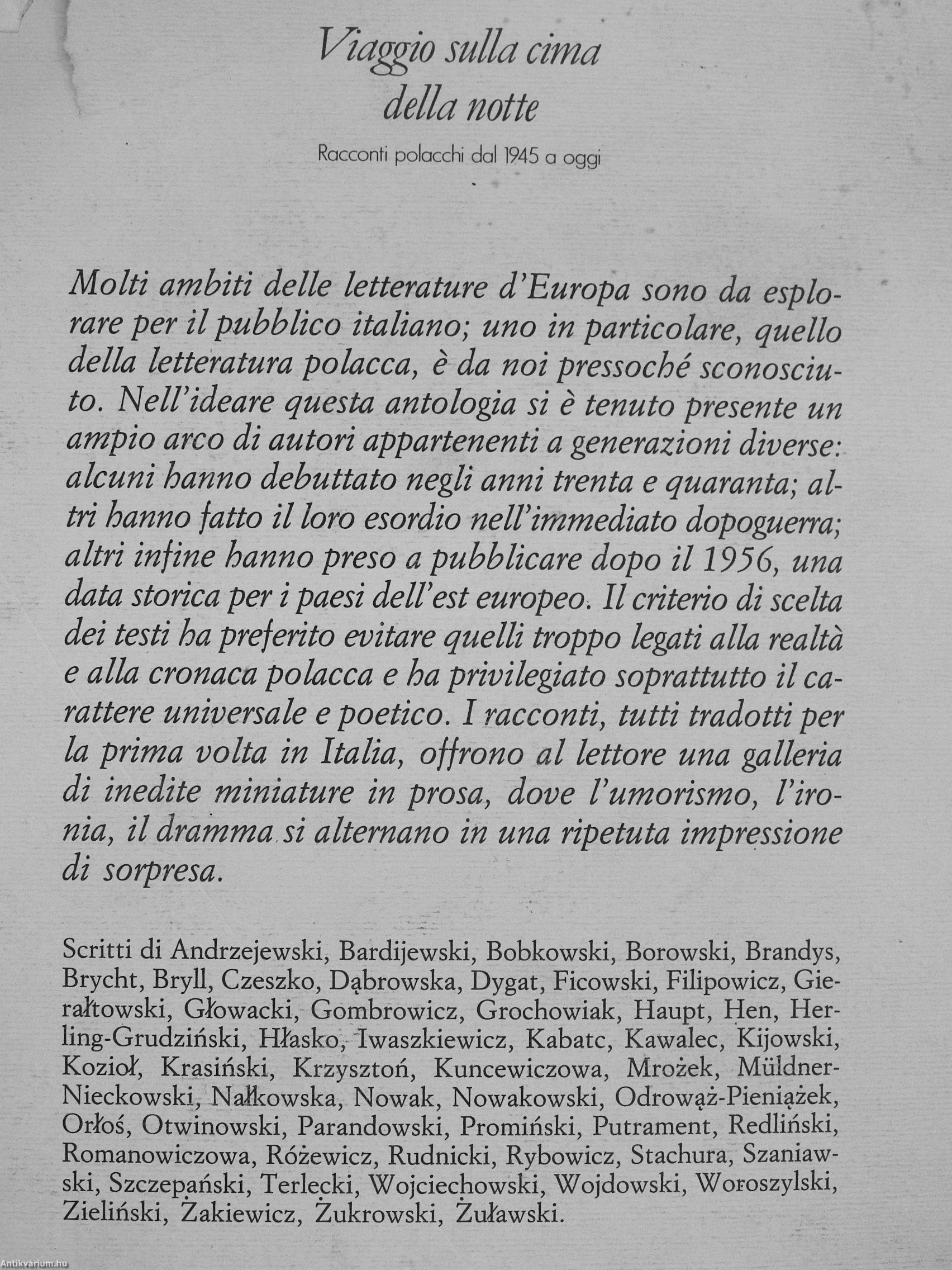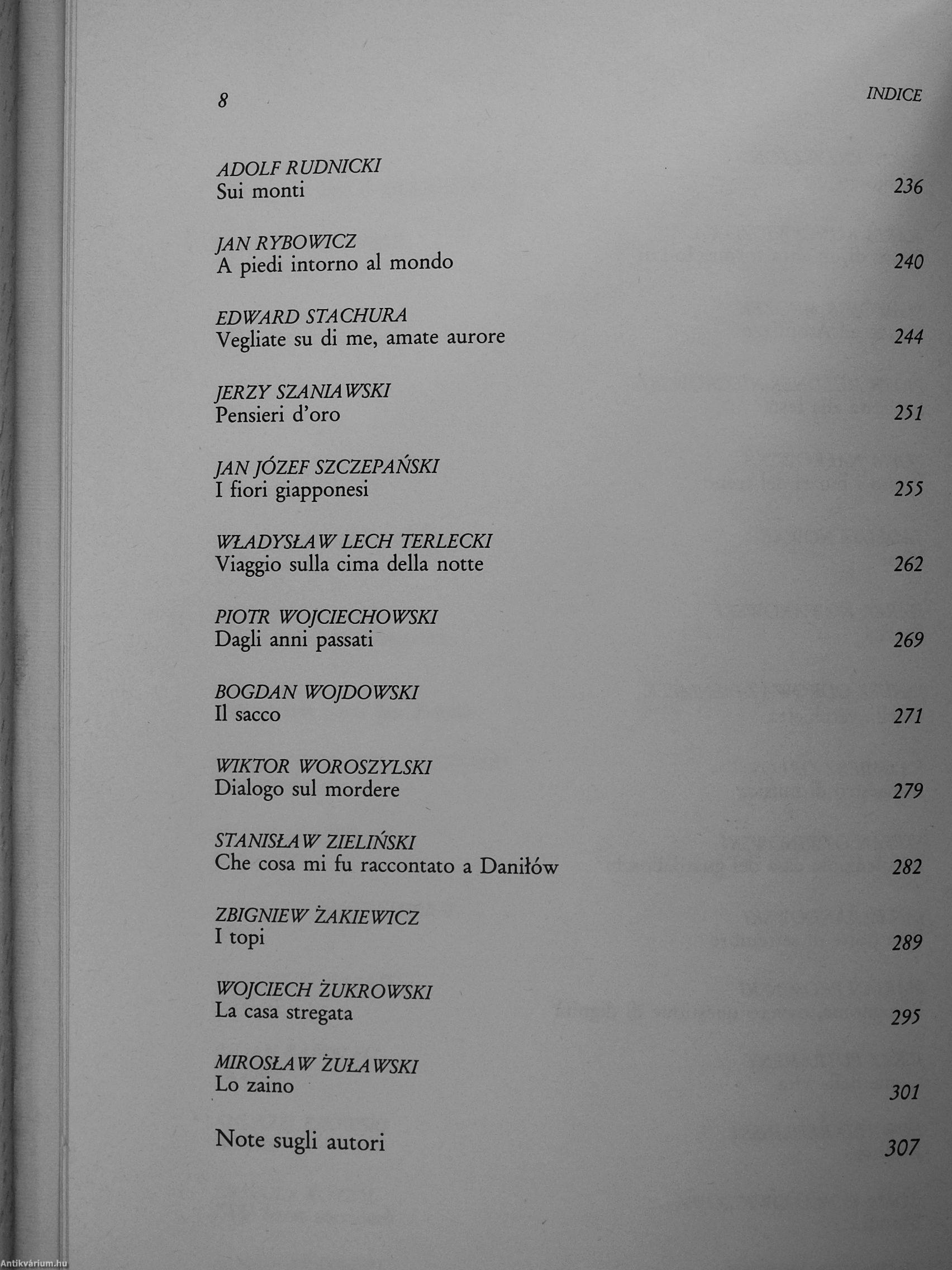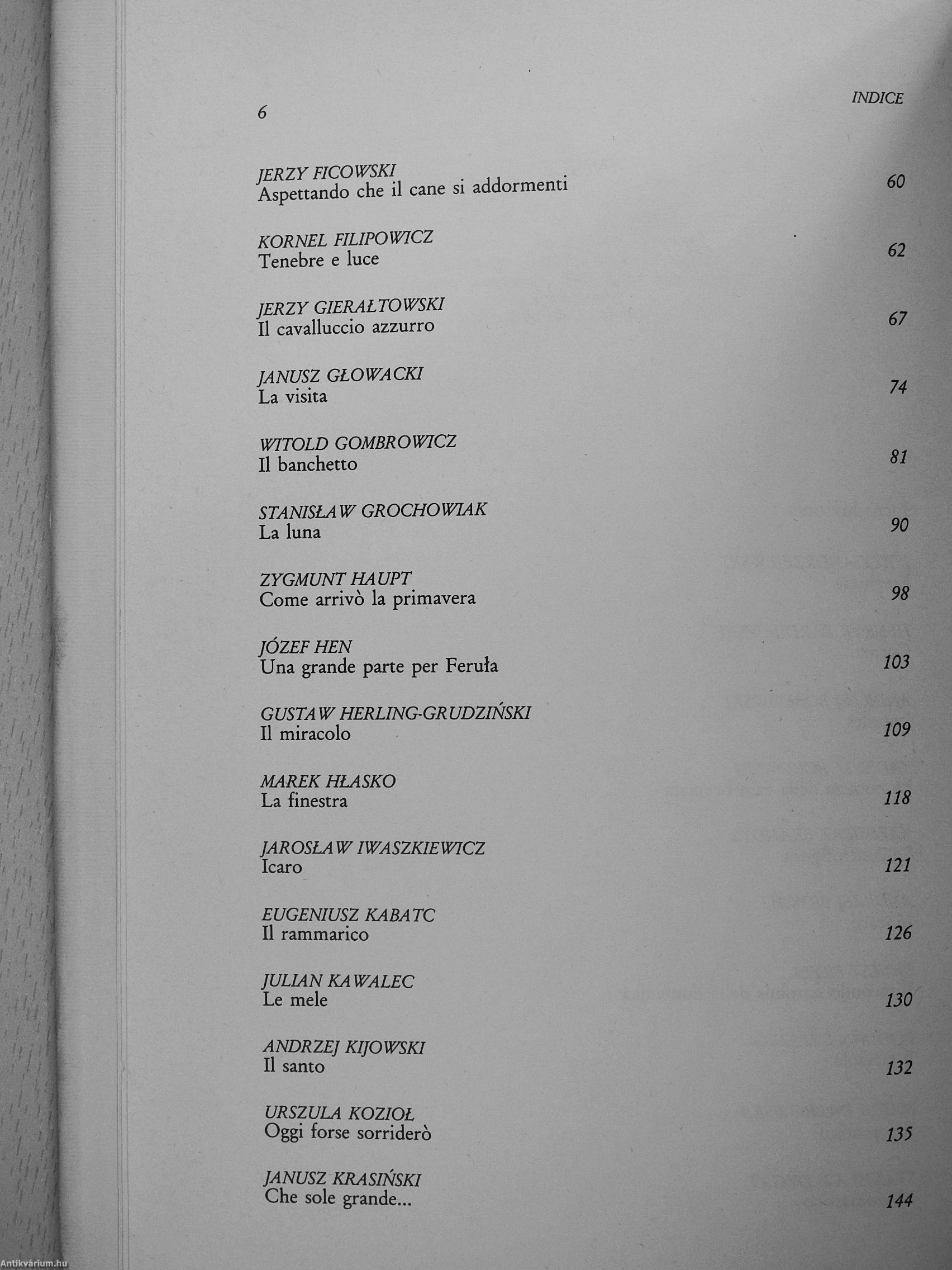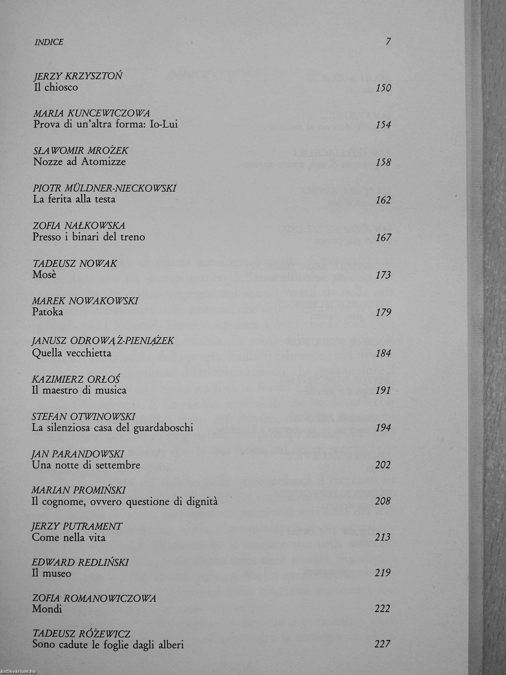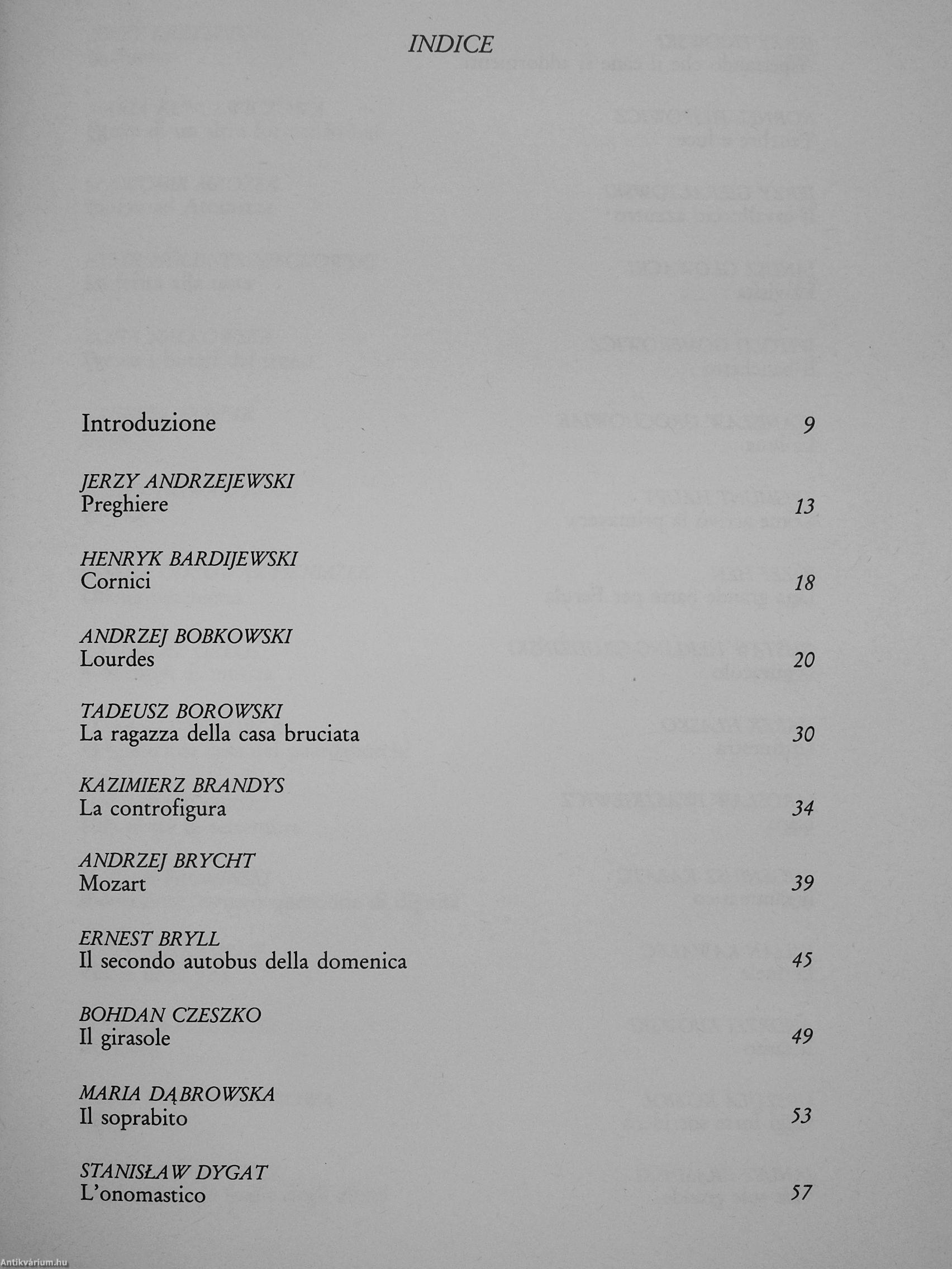 Scritti di Andrzejewski, Bardijewski, Bobkowski, Borowski, Brandys Brycht, Bryll, Czeszko, Dabrowska, Dygat, Ficowski, Filipowicz, Gie raítowski, Glbwacki, Gombrowicz, Grochowiak, Haupt, Hen, Her ling-Grudzinski, Wasko, Iwaszkiewicz, Kabatc, Kawalec, Kijowski Kozioi', Krasinski, Krzyszton, Kuncewiczowa, Mrozek, Müldner Nieckowski, NaUcowska, Nowak, Nowakowski, Odrowaz-Pieniazek Oribs, Otwinowski, Parandowski, Promiriski, Putrament, Redlinski Romanowiczowa, Rózewicz, Rudnicki, Rybowicz, Stachura, Szaniaw ski, Szczepanski, Terlecki, Wojciechowski, Wojdowski, Woroszylski Zielinskj, Zakiewicz, Zukrowski, Zulíawski.
