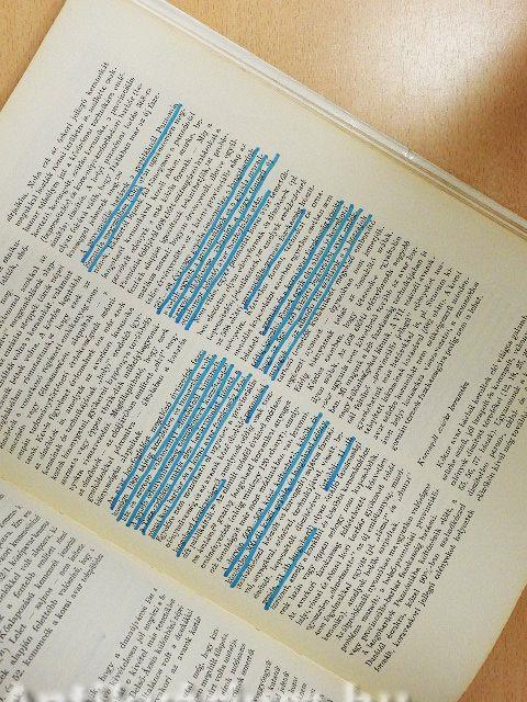 A védőborító kopott, a lapélek és néhány lap foltos, rajta színes sorkiemelés látható.
