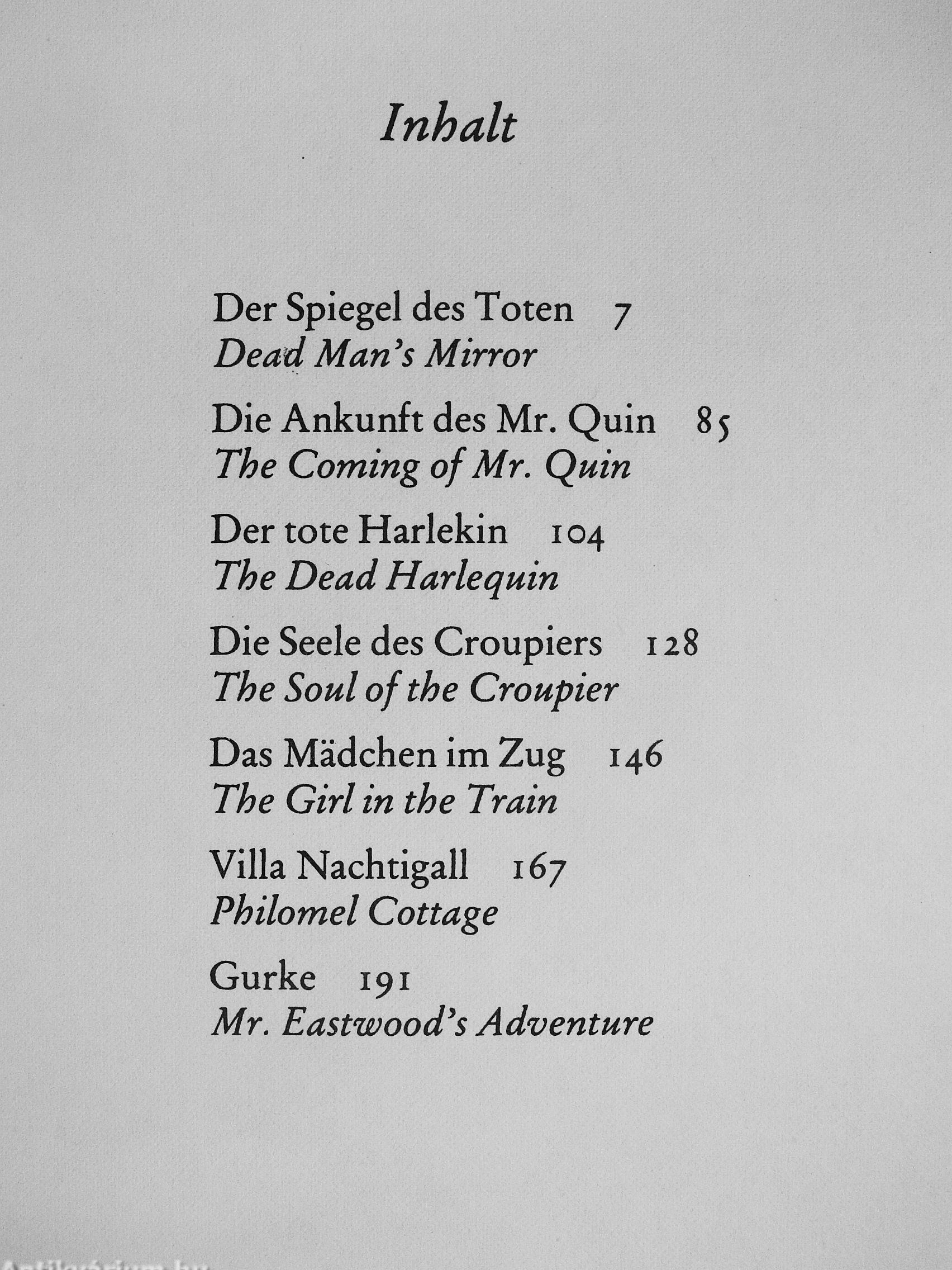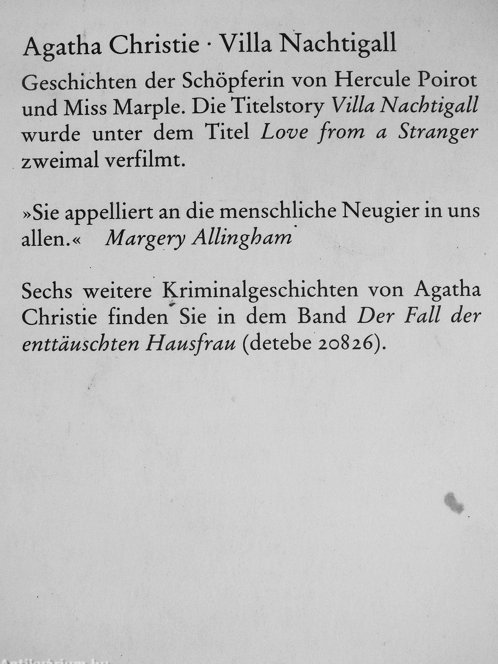 Geschichten der Schöpferin von Hercule Poirot und Miss Marple. Die Titelstory Villa Nachtigall wurde unter dem Titel Love from a Stranger zweimal verfilmt.