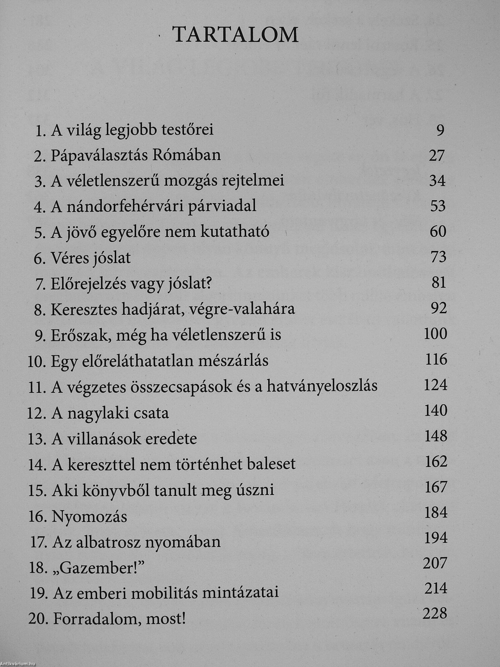 A használatuk közben hagyott elektronikus nyomok - a hangüzenetektől a netes keresésekig - olyan gazdag adatbázis összeállítását tették lehetővé, amilyet korábban elképzelni sem tudtunk volna. Követhetővé vált a mozgásunk, a döntéseink, az egész életünk. E nyomok elemzése fontos felfedezéshez vezetett: a véletlen korántsem uralja oly mértékben az életünket, mint ahogy eddig gondoltuk. A könyv ennek a meglepő kutatásnak az eredményeivel ismerteti meg az olvasót. A szerző rávilágít, hol ér véget az emberi viselkedésben a spontaneitás, és hol kezdődik a kiszámíthatóság.
