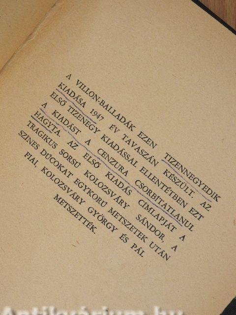 Megjegyzés: A Villon-balladák ezen tizennegyedik kiadása 1947 tavaszán készült. Az első tizenegy kiadással ellentétben ezt a kiadást a cenzura csorbítatlanul hagyta. Fekete-fehér metszetekkel.