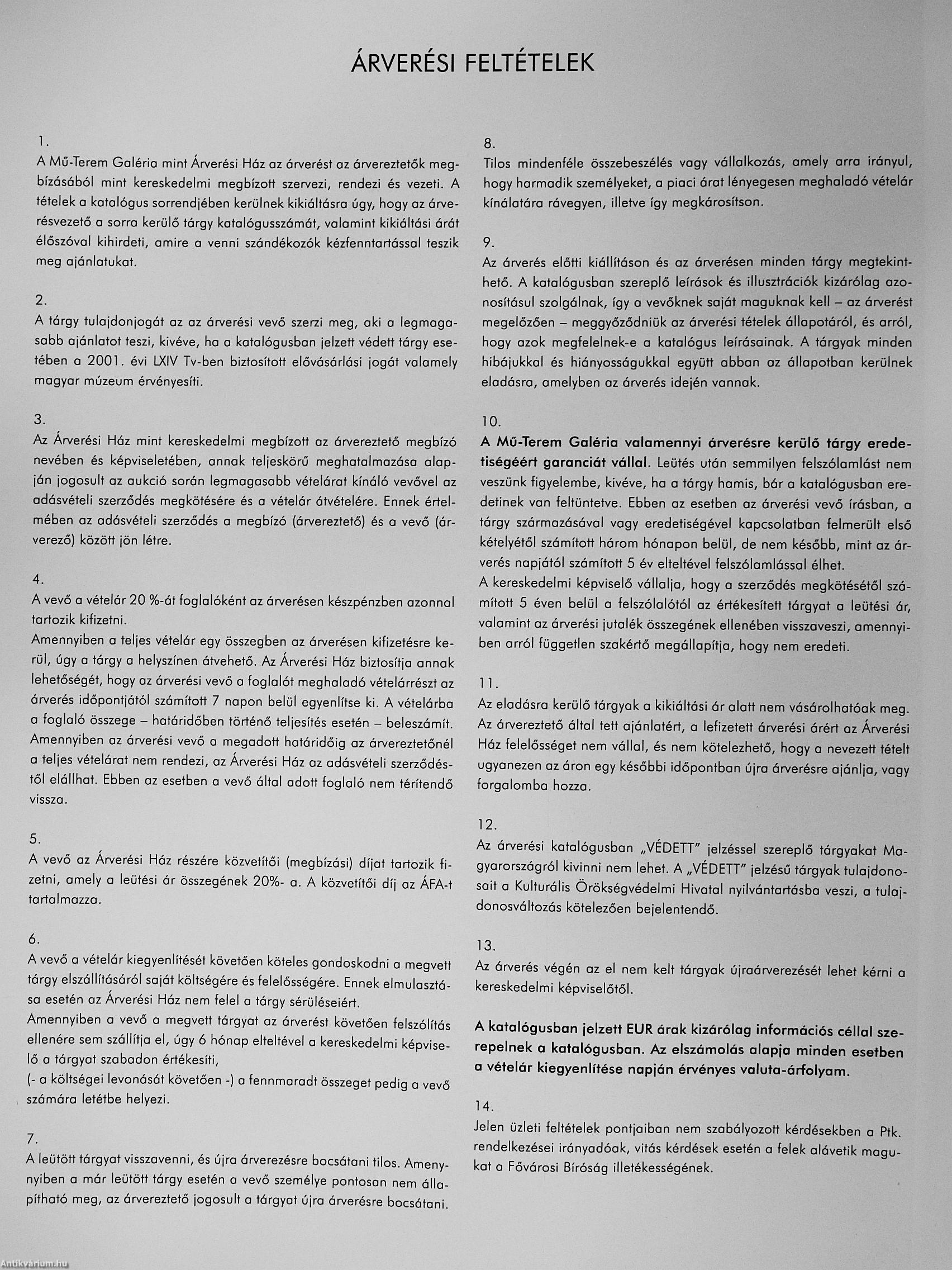 | Megjegyzés: | Árverési katalógus. Színes fotókkal. Angol nyelvű árverési feltételekkel. További grafikusok a könyvben. Az árverést vezeti: Virág Judit és Kelen Anna. |
