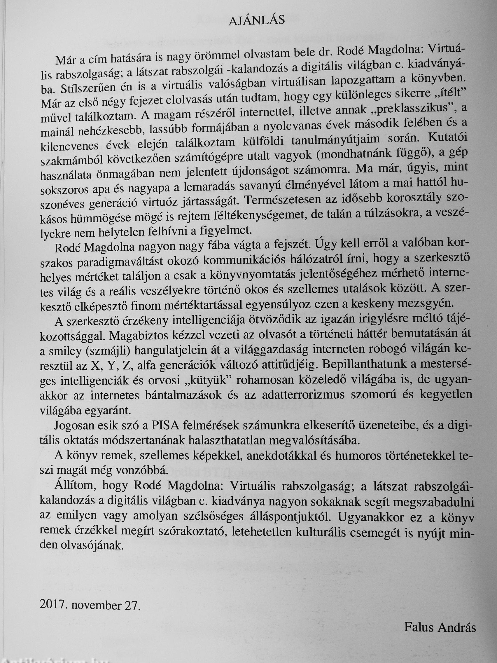 Hogy magam függő vagyok-e? Enyhe fokban igen, ha nincs nálam a telefonom, csökkent a komfortfokozatom, ha nincs net, szomorkodom. Rodé doktornő könyve, mint épp a „lejtőn" lefele csusszanót a legjobb pillanatban ért. Jó szívvel ajánlom hát minden hálóhalásznak.
