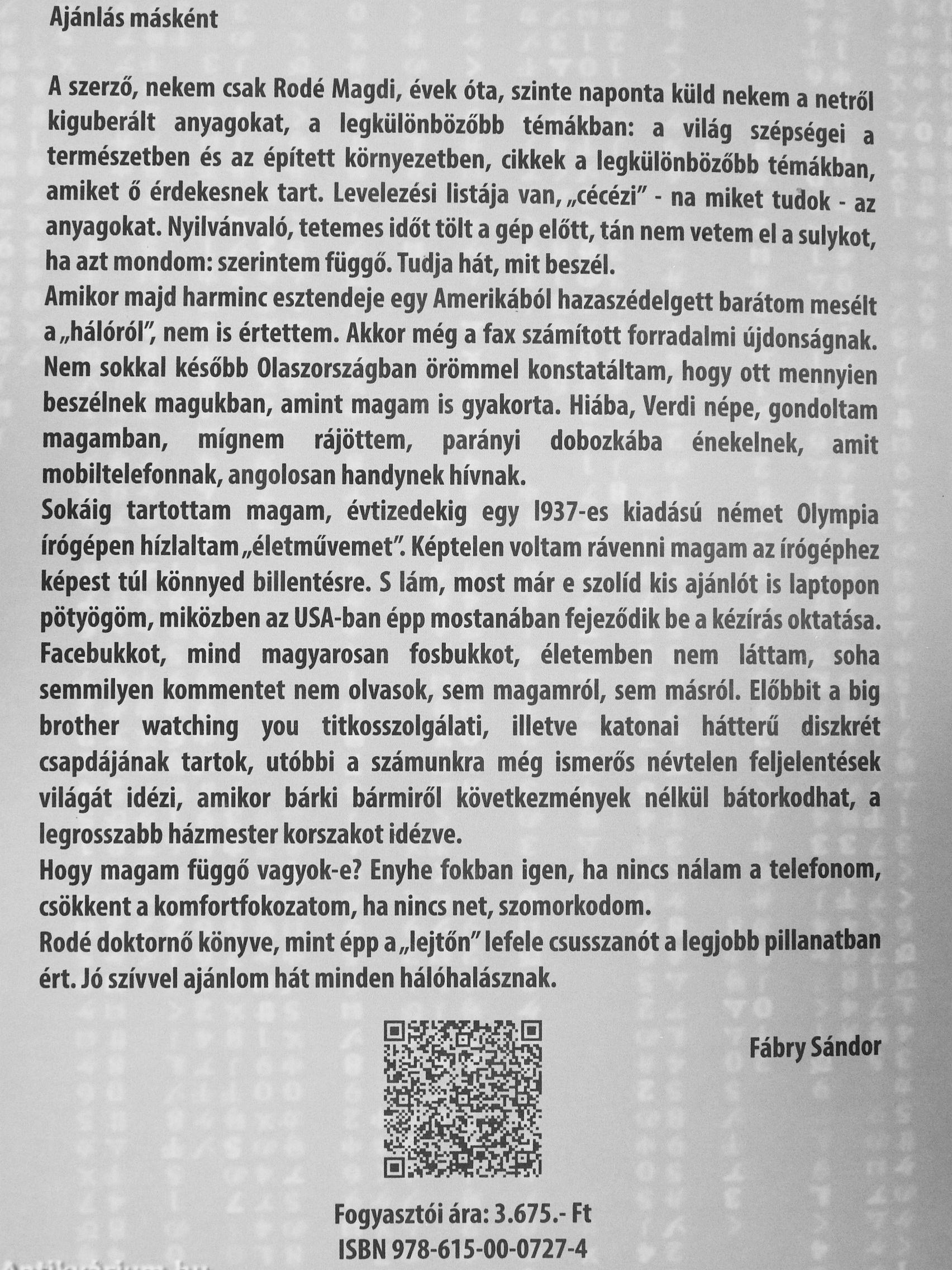 Sokáig tartottam magam, évtizedekig egy 1937-es kiadású német Olympia írógépen hizlaltam „életművemet". Képtelen voltam rávenni magam az írógéphez képest túl könnyed billentésre. S lám, most már e szolid kis ajánlót is laptopon pötyögöm, miközben az USA-ban épp mostanában fejeződik be a kézírás oktatása. Facebukkot, mind magyarosan fosbukkot, életemben nem láttam, soha semmilyen kommentet nem olvasok, sem magamról, sem másról. Előbbit a big brother watching you titkosszolgálati, illetve katonai hátterű diszkrét csapdájának tartok, utóbbi a számunkra még ismerős névtelen feljelentések világát idézi, amikor bárki bármiről következmények nélkül bátorkodhat, a legrosszabb házmester korszakot idézve.