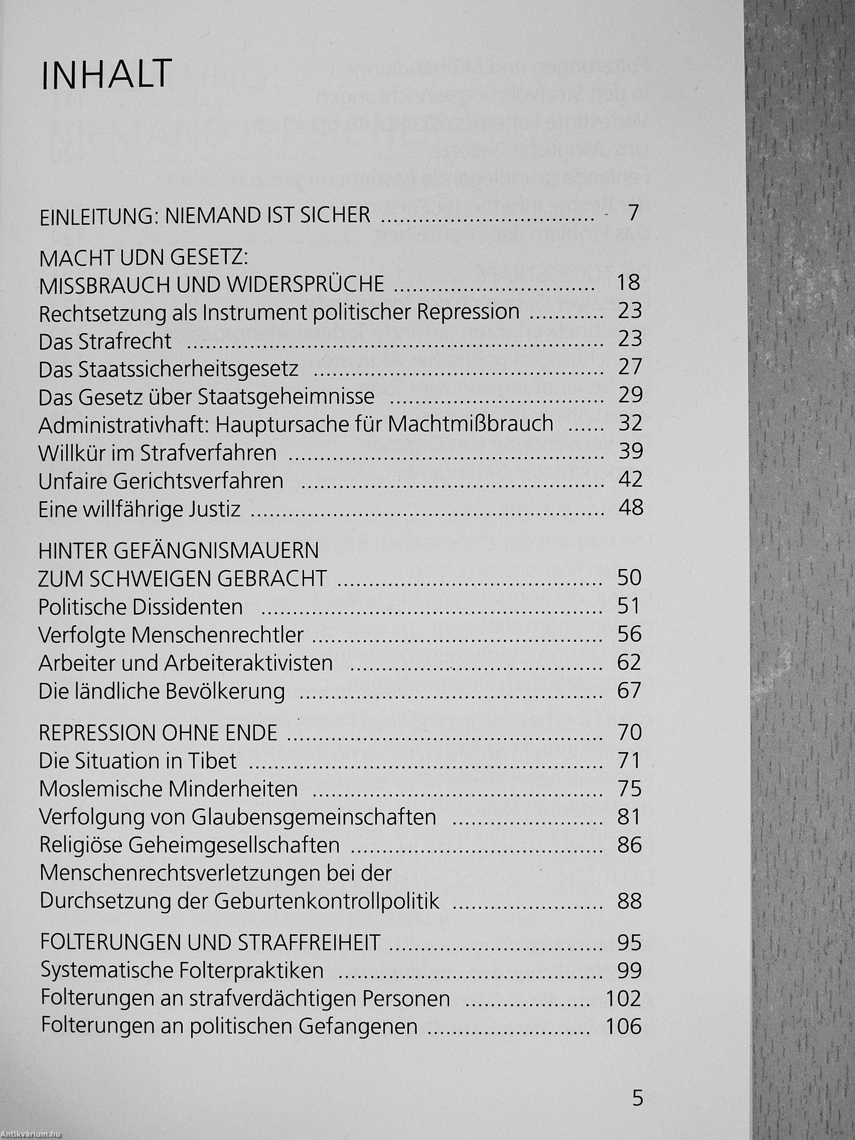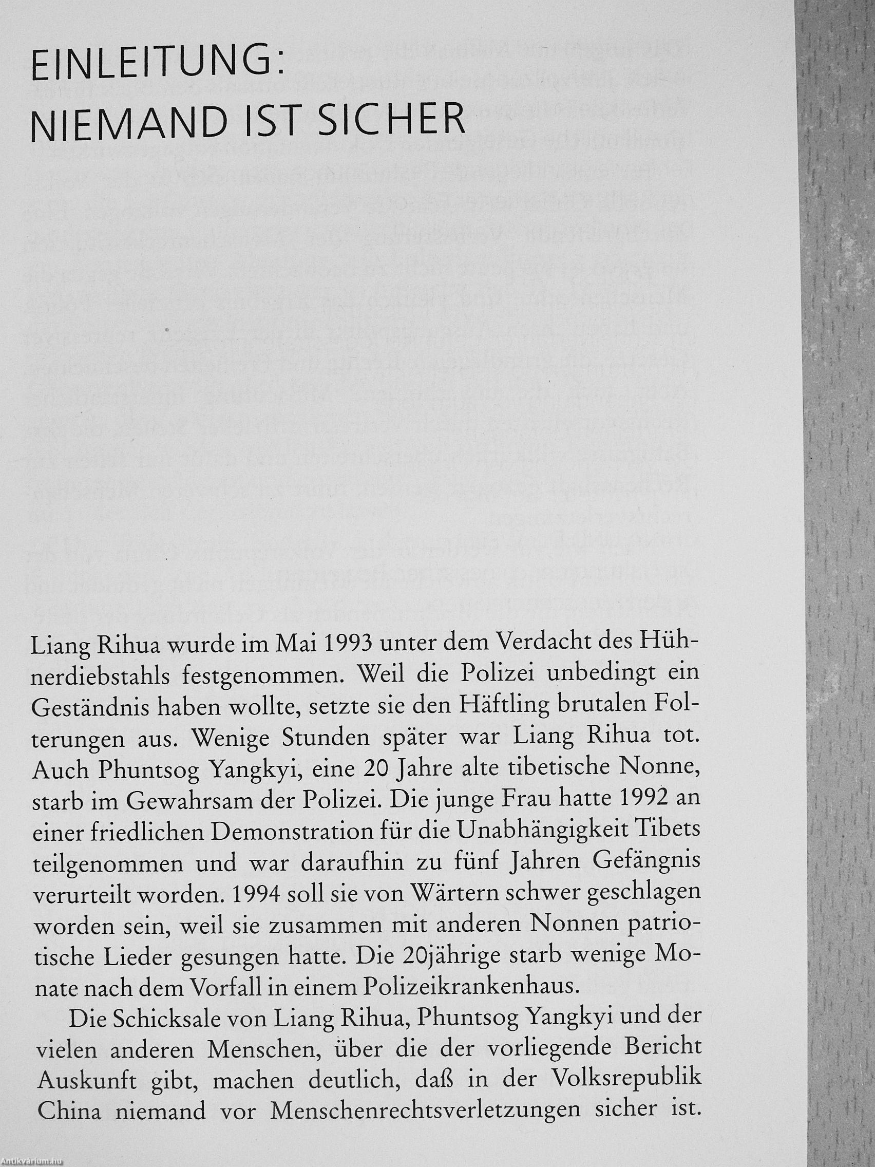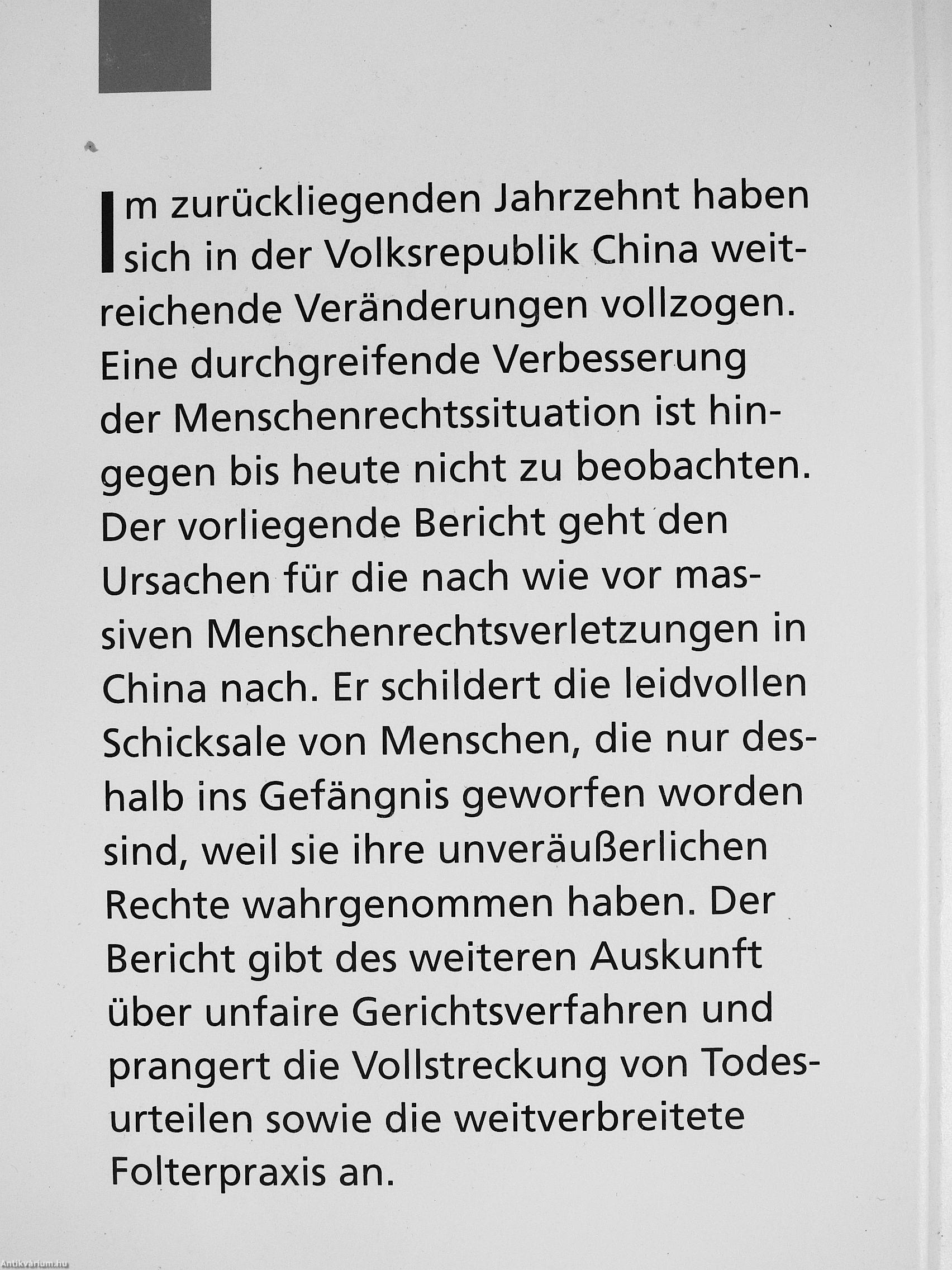 Im zurückliegenden Jahrzehnt haben sich in der Volksrepublik China weitreichende Veränderungen vollzogen. Eine durchgreifende Verbesserung der Menschenrechtssituation ist hingegen bis heute nicht zu beobachten. Der vorliegende Bericht geht den Ursachen für die nach wie vor massiven Menschenrechtsverletzungen in China nach. Er schildert die leidvollen Schicksale von Menschen, die nur deshalb ins Gefängnis geworfen worden sind, weil sie ihre unveräußerlichen Rechte wahrgenommen haben. Der Bericht gibt des weiteren Auskunft über unfaire Gerichtsverfahren und prangert die Vollstreckung von Todesurteilen sowie die weitverbreitete Folterpraxis an.