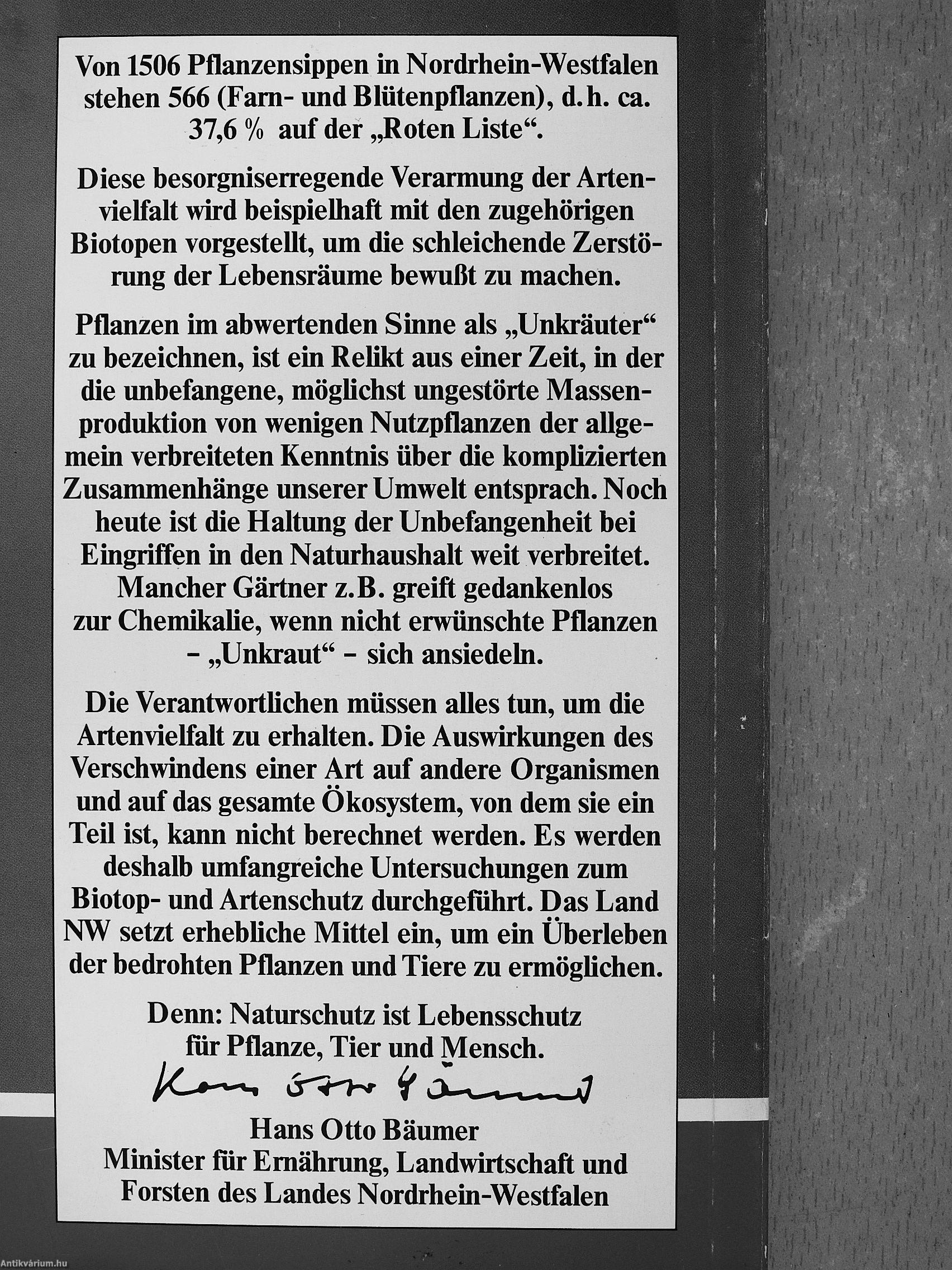 Pflanzen im abwertenden Sinne als „Unkräuter" zu bezeichnen, ist ein Relikt aus einer Zeit, in der die unbefangene, möglichst ungestörte Massenproduktion von wenigen Nutzpflanzen der allgemein verbreiteten Kenntnis über die komplizierten Zusammenhänge unserer Umwelt entsprach. Noch heute ist die Haltung der Unbefangenheit bei Emgriffen in den Naturhaushalt weit verbreitet.