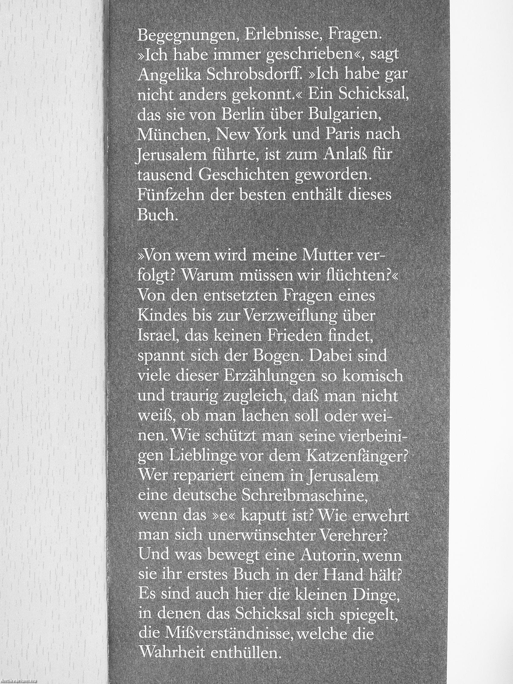 Begegnungen, Erlebnisse, Fragen. »Ich habe immer geschrieben«, sagt Angelika SchrobsdorfF. »Ich habe gar nicht anders gekonnt.« Ein Schicksal, das sie von Berlin über Bulgarien, München, New York und Paris nach Jerusalem führte, ist zum Anlaß für tausend Geschichten geworden. Fünfzehn der besten enthält dieses Buch.