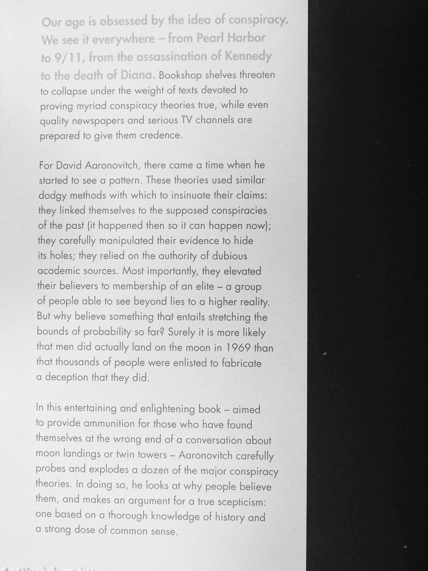 'This book is really frightening - it shows how both Left and Right are more susceptible than ever to idiot conspiracy theories that a five-year-old should be able to see through. Aaronovitch does not spare his victims, and nor should he. As he shows, the poisoning of our imaginations by , ^ paranoia is a 21st-century tragedy.' -