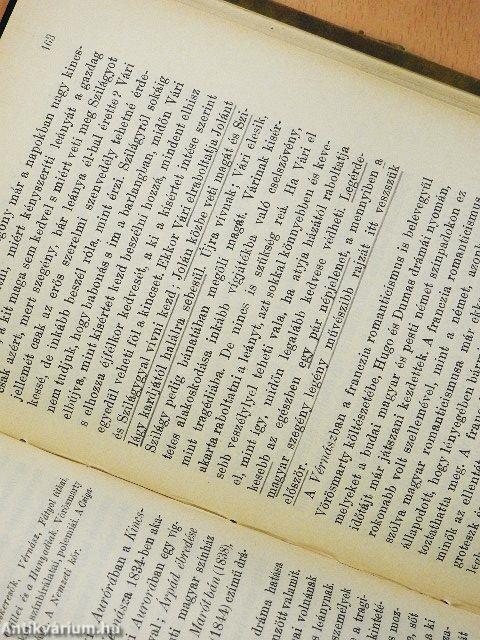 | Akadémiai jutalmak, megtiszteltetések, írói tiszteletdíjak. Széchenyi hatása Vörösmartyra. A magyar hazafi lírai jellemzése. A Szózat és más hazafi ódák. A magyar költészet és az ellenzék. Párhuzam Berzsenyi és Vörösmarty közt. Újabb lírai költemények. Csajághy Laura. Költői veszélyek. Szép Ilonka. | 192 |