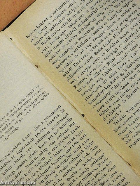 | Vörösmarty Görbön mint patvarista. Az elbúsult deák című drámája. Első föllépte a Koszorú-ban. Az 1823-iki politikai mozgalmak hatása. Zalán futása-ba kezd. Zrínyi, Gyöngyösi és a XVIII. század epikusai. Epikai mozgalmak a jelen század elején. Aranyosrákosi Székely Sándor. Vörösmarty első szerelme. Perczel Etelka | 38 |