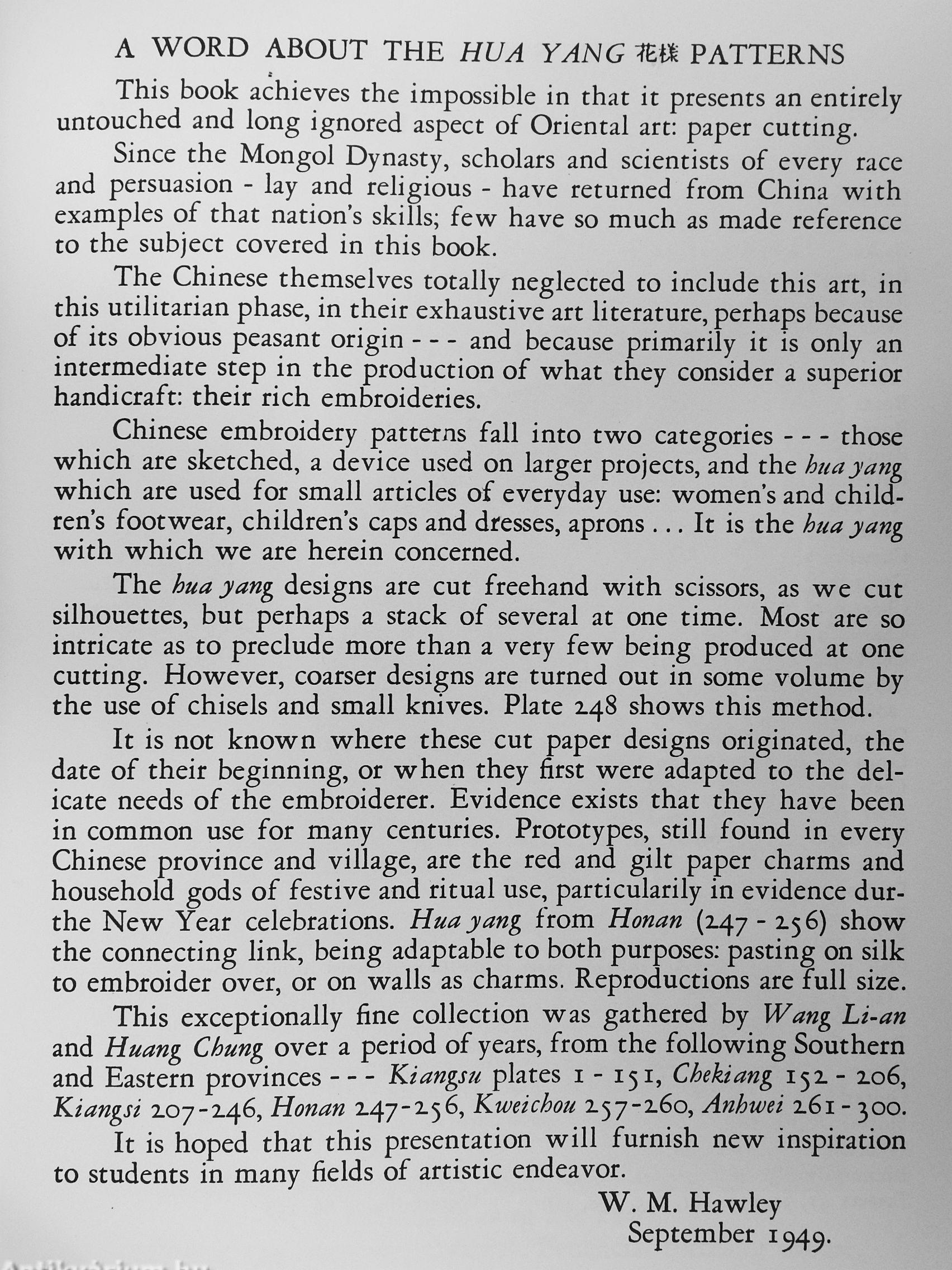 What has lor cemuries characterized Chinese an so absolutely, what in fact has been generic to it, is the intense belief in the "aliveness" of all things. Subjects depicted in Chinese art, be they animate or inanimate, grow, move, have rhythm and vibrance, change, become in short are endowed with living energy. Nowhere is this more keenly seen or felt than in a relatively minor but nonetheless rich aspect of this art—the hua yang designs, intricate patterns cut freehand from paper in germinating, animistic lines.