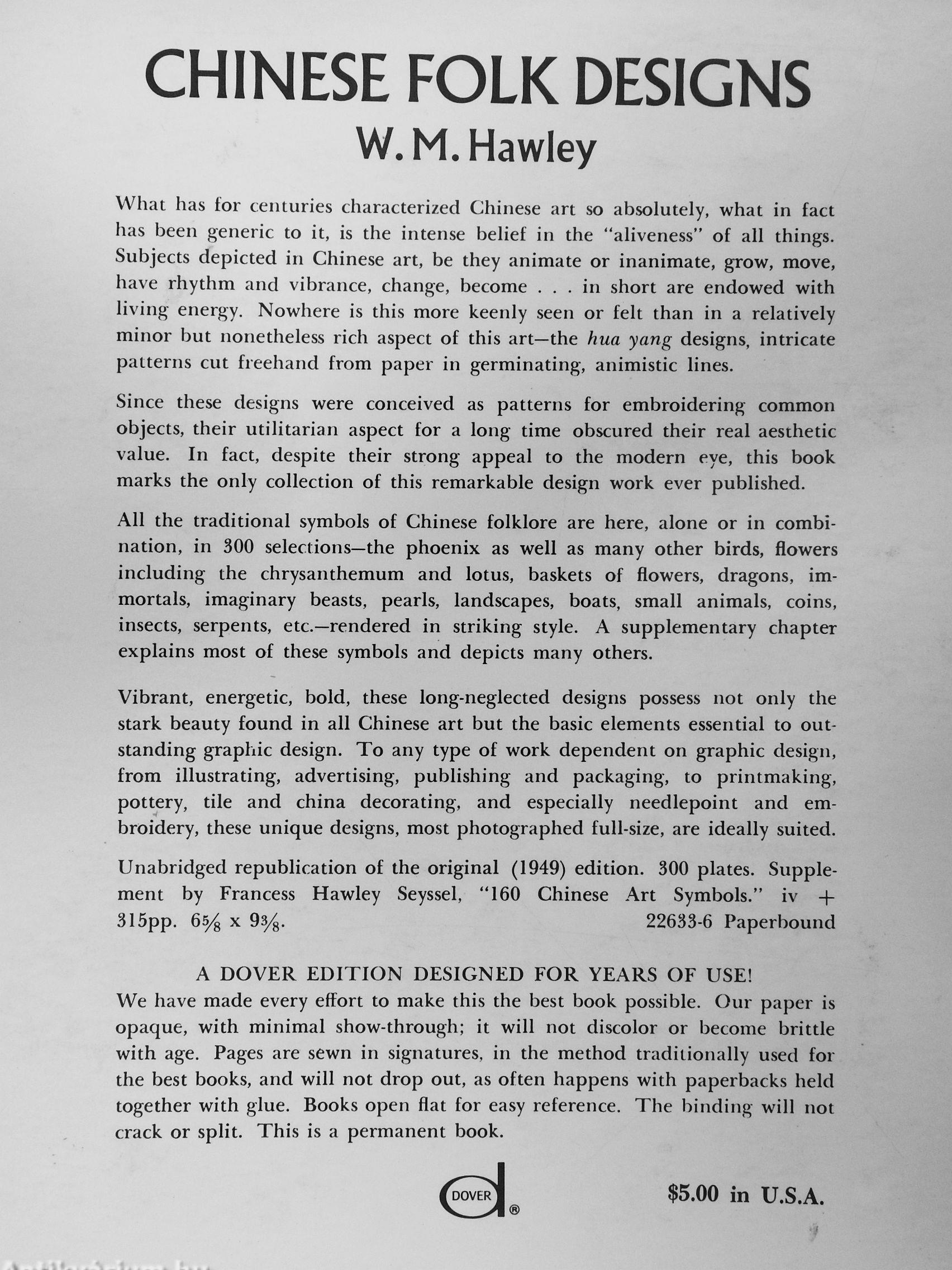 Vibrant, energetic, bold, these long-neglected designs possess not only the stark beauty found in all Chinese art but the basic elements essential to outstanding graphic design. To any type of work dependent on graphic design, from illustrating, advertising, publishing and packaging, to printmaking, pottery, tile and china decorating, and especially needlepoint and embroidery, these unique designs, most photographed full-size, are ideally suited.