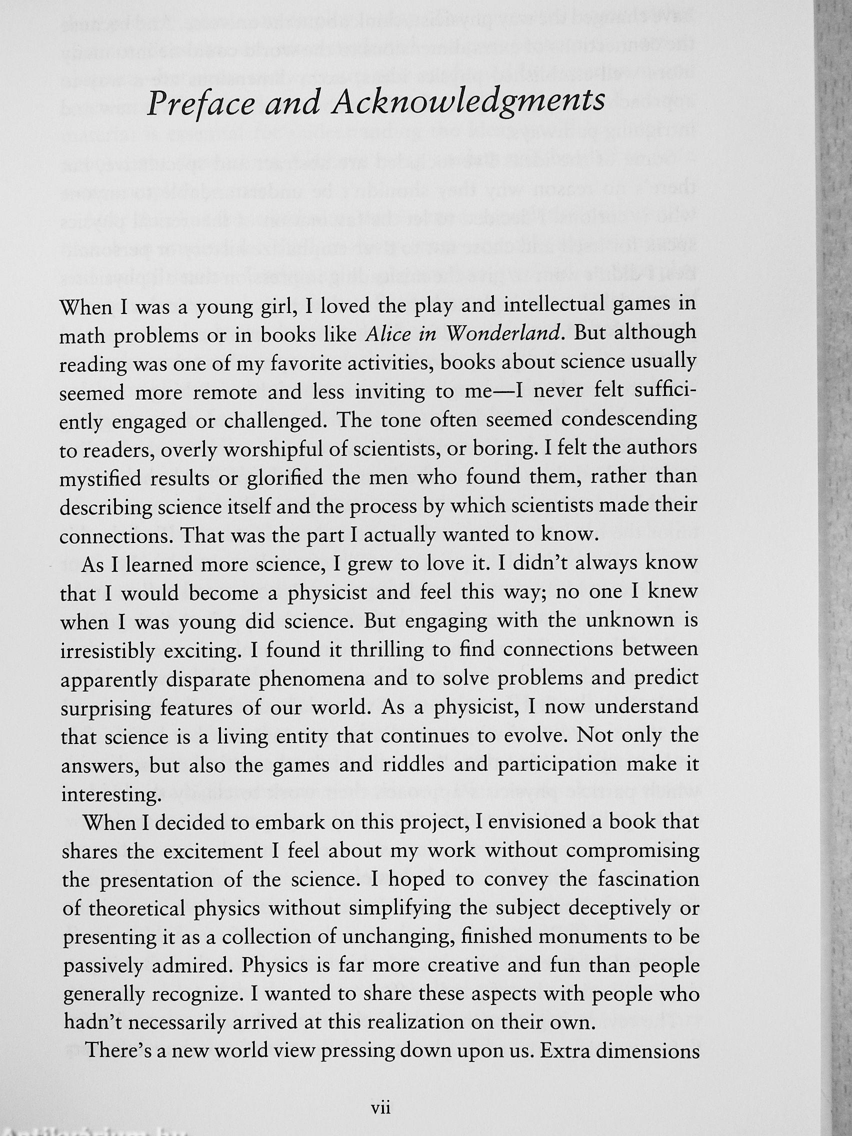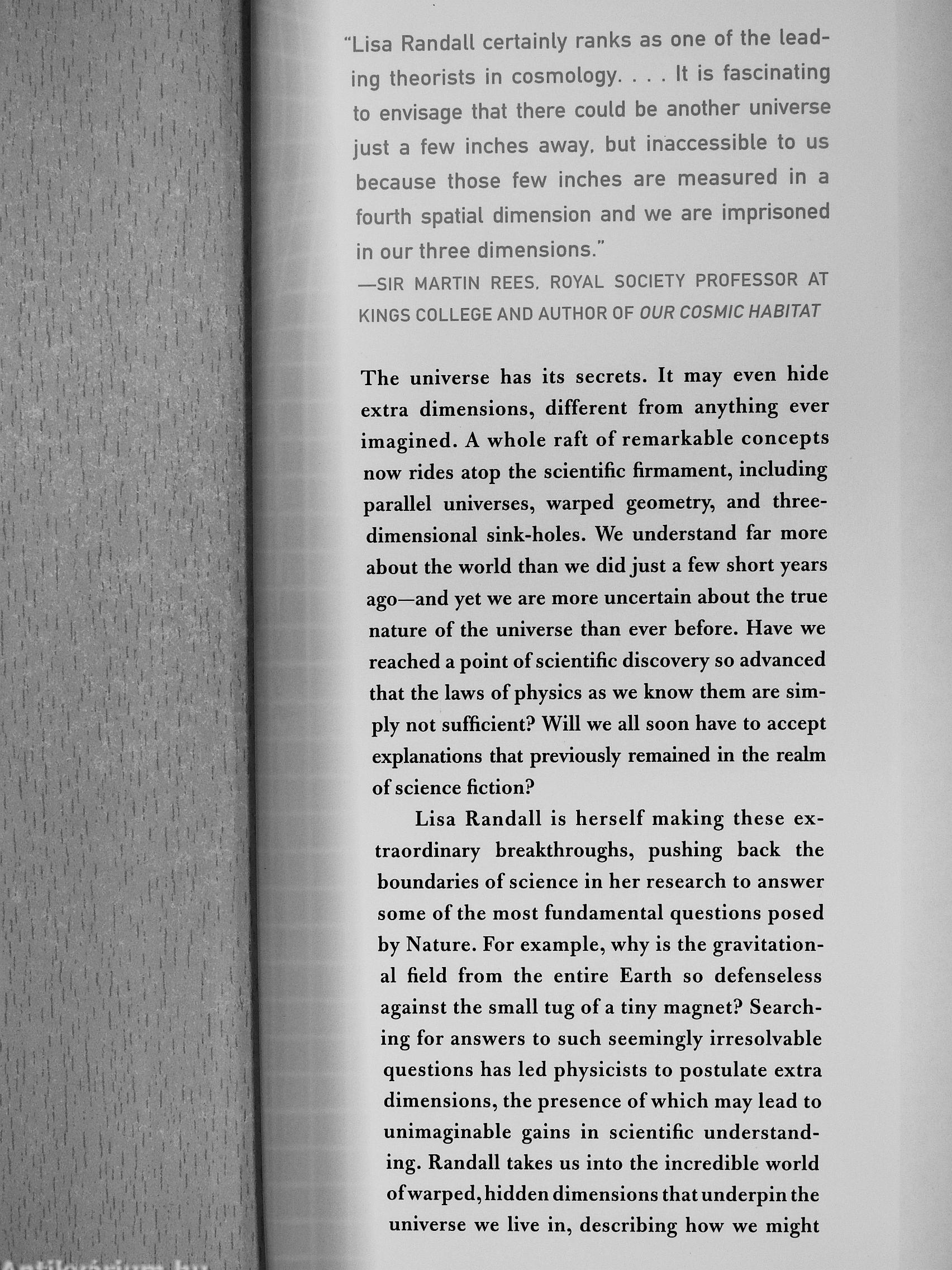 "Lisa Randall certainly ranks as one of the leading theorists in cosmology. It is fascinating to envisage that there could be another universe just a fewi inches away, but inaccessible to us because those few inches are measured in a fourth spatial dimension and we are imprisoned in our three dimensions."