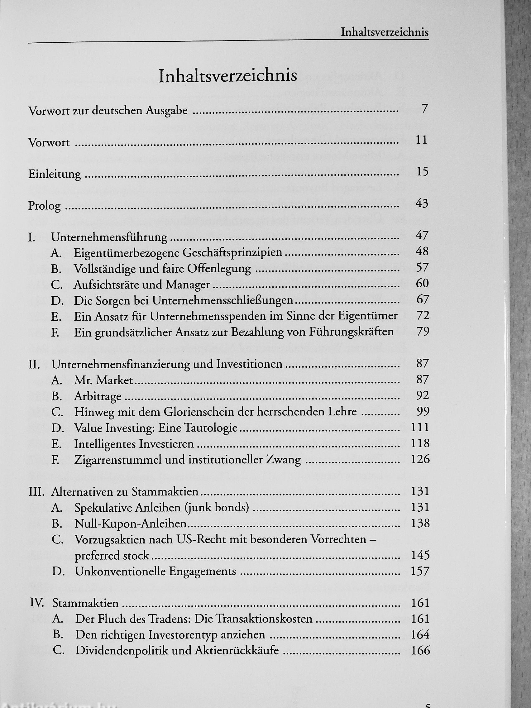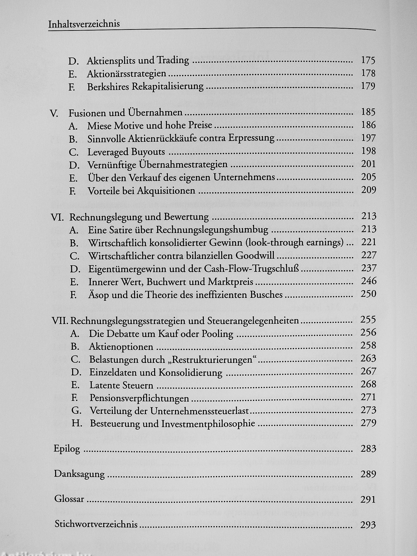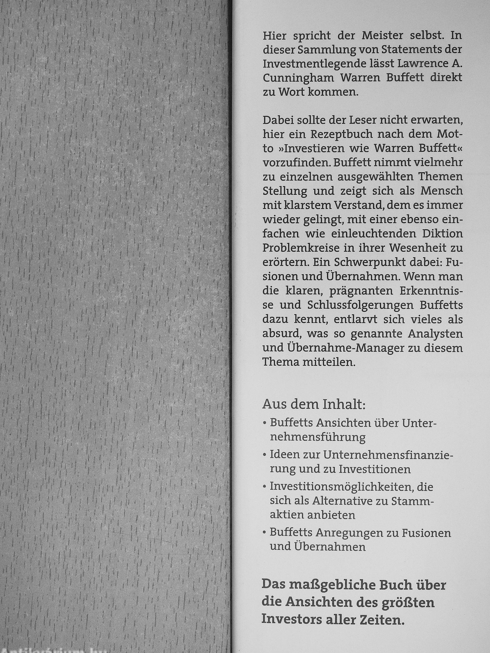 Dabei sollte der Leser nicht erwarten, hier ein Rezeptbuch nach dem Motto »Investieren wie Warren Buffett« vorzufinden. Buffett nimmt vielmehr zu einzelnen ausgewählten Themen Stellung und zeigt sich als Mensch mit klarstem Verstand, dem es immer wieder gelingt, mit einer ebenso einfachen wie einleuchtenden Diktion Problemkreise in ihrer Wesenheit zu erörtern. Ein Schwerpunkt dabei: Fusionen und Übernahmen. Wenn man die klaren, prägnanten Erkenntnisse und Schlussfolgerungen Buffetts dazu kennt, entlarvt sich vieles als absurd, was so genannte Analysten und Übernahme-Manager zu diesem Thema mitteilen.