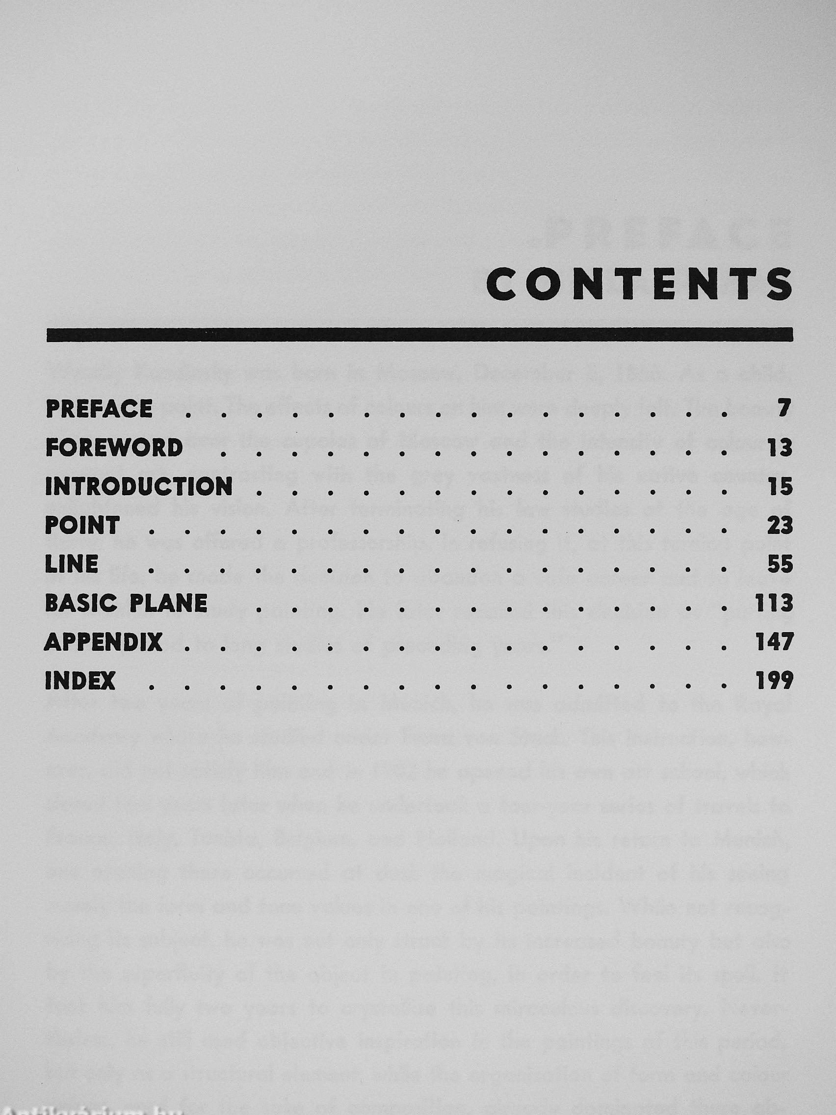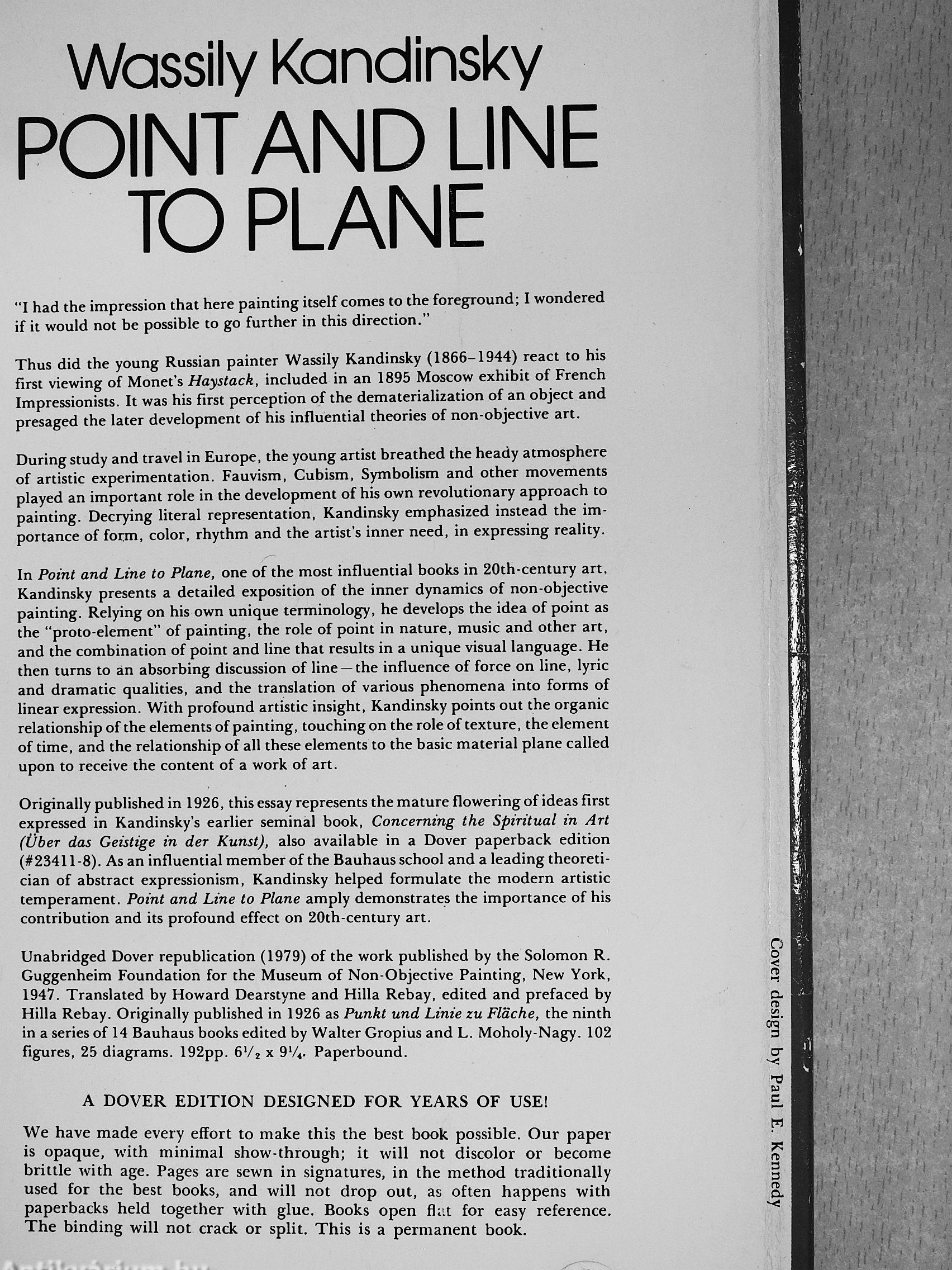 In Point and Line to Plane, one of the most influential books in 20th-century art. Kandinsky presents a detailed exposition of the inner dynamics of non-objective painting. Relying on his own unique terminology, he develops the idea of point as the "proto-element" of painting, the role of point in nature, music and other art, and the combination of point and line that results in a unique visual language. He then turns to an absorbing discussion of line — the influence of force on line, lyric and dramatic qualities, and the translation of various phenomena into forms of linear expression. With profound artistic insight, Kandinsky points out the organic relationship of the elements of painting, touching on the role of texture, the element of time, and the relationship of all these elements to the basic material plane called upon to receive the content of a work of art.