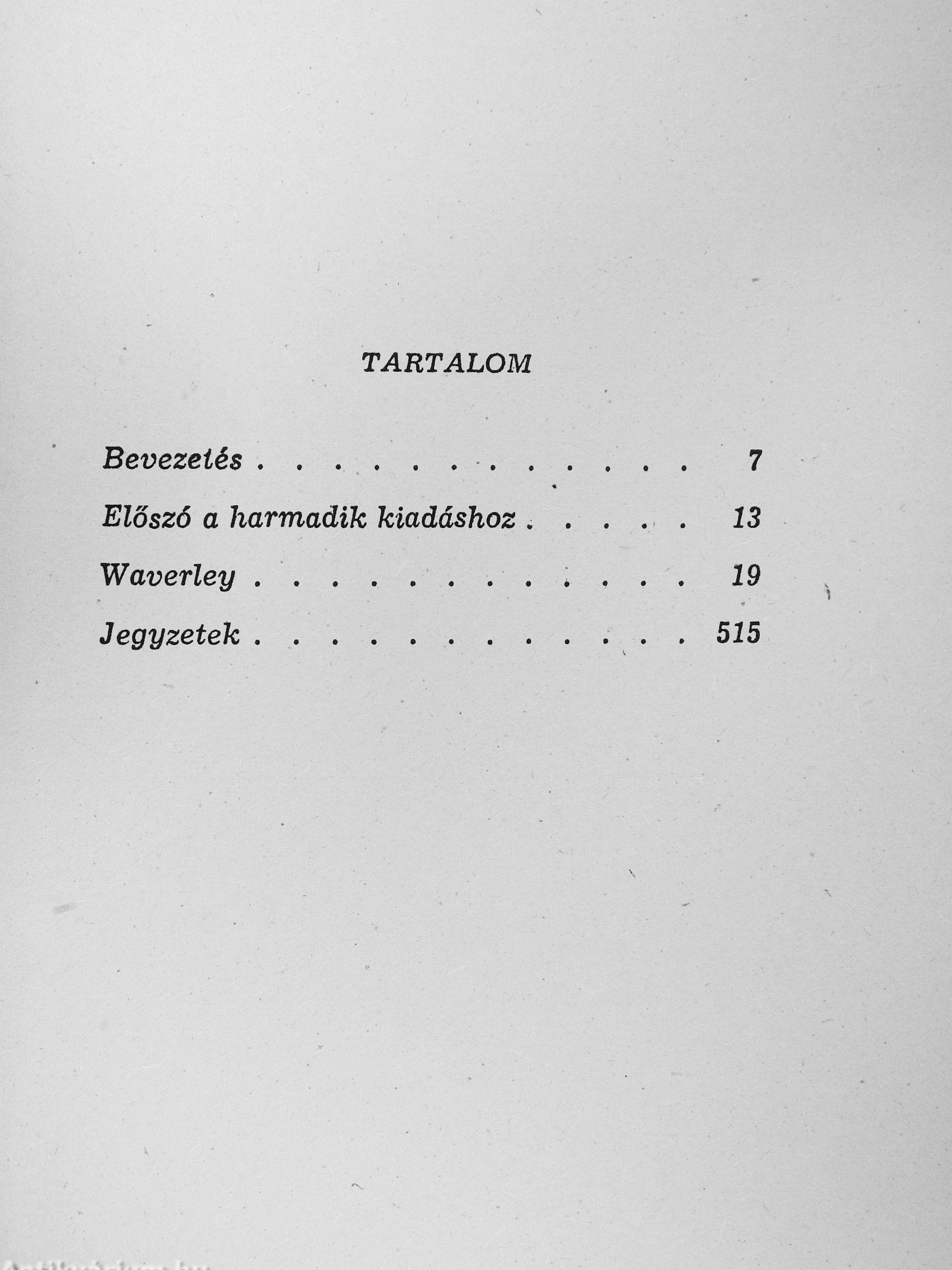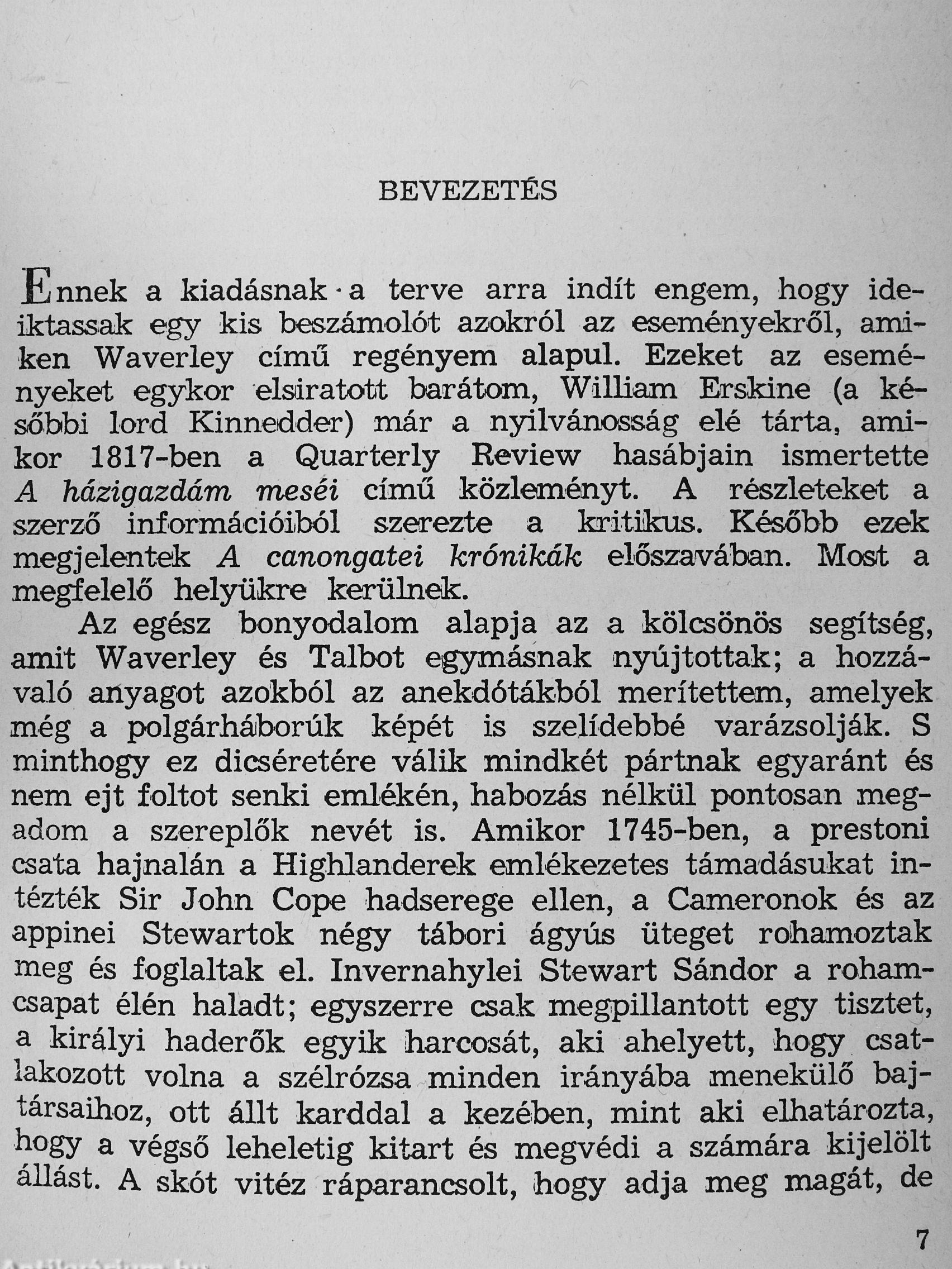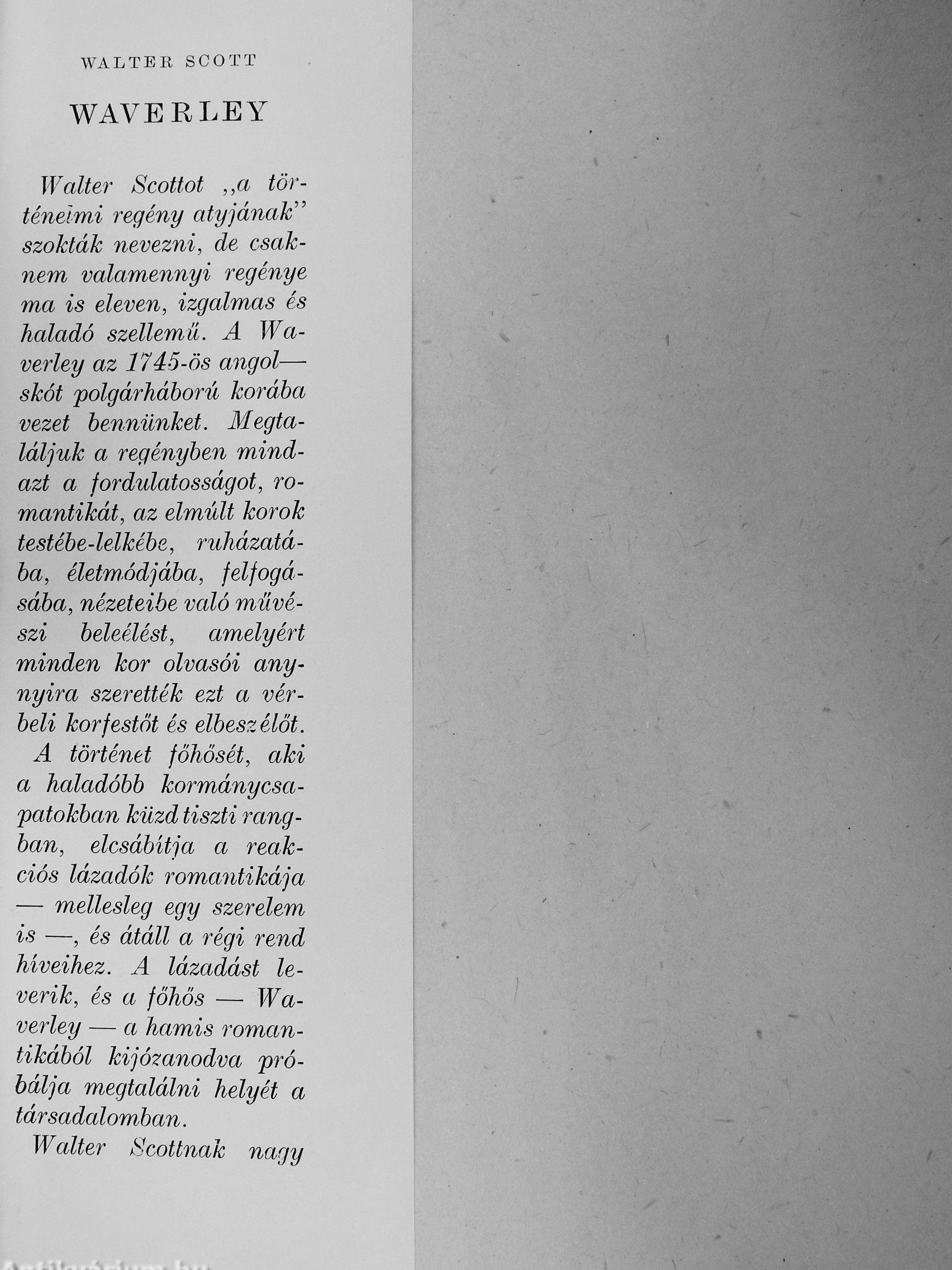 W altér Scottot „a történelmi regény atyjának" szokták nevezni, de csaknem valamennyi regénye ma is eleven, izgalmas és haladó szellemű. A Waverley az 1745-ös angol— skót polgárháború korába vezet bennünket. Megtaláljuk a regényben mindazt a fordulatosságot, romantikát, az elmúlt korok testébe-lelkébe, ruházatába, életmMjába, felfogásába, nézeteibe való művészi beleélést, amelyért minden kor olvasói any-nyira szerették ezt a vérbeli korfestât és elbeszélőt.