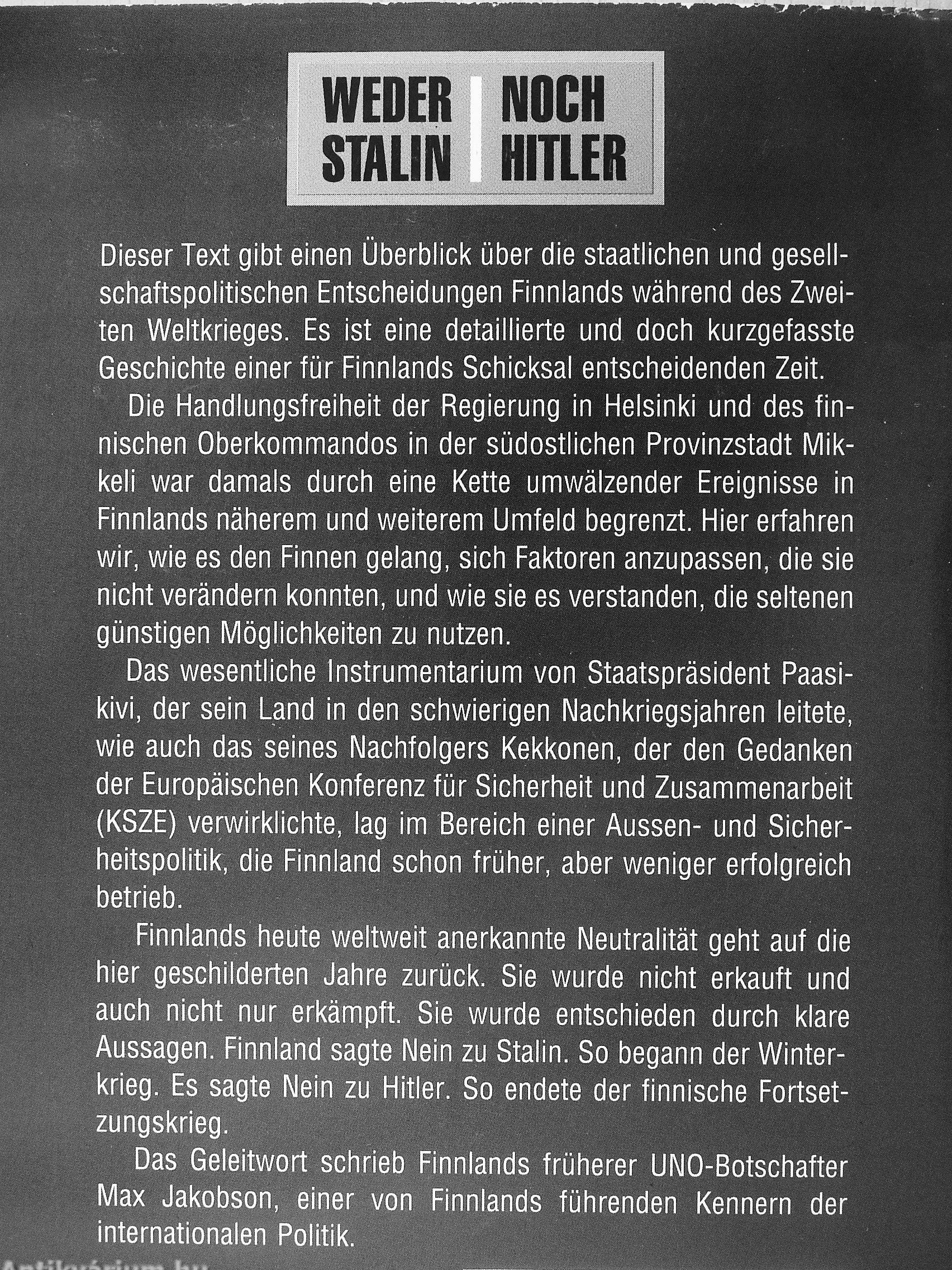 Finnlands heute weltweit anerkannte Neutralität geht auf die hier geschilderten Jahre zurück. Sie wurde nicht erkauft und auch nicht nur erkämpft. Sie wurde entschieden durch klare Aussagen. Finnland sagte Nein zu Stalin. So begann der Winterkrieg. Es sagte Nein zu Hitler. So endete der finnische Fortsetzungskrieg.