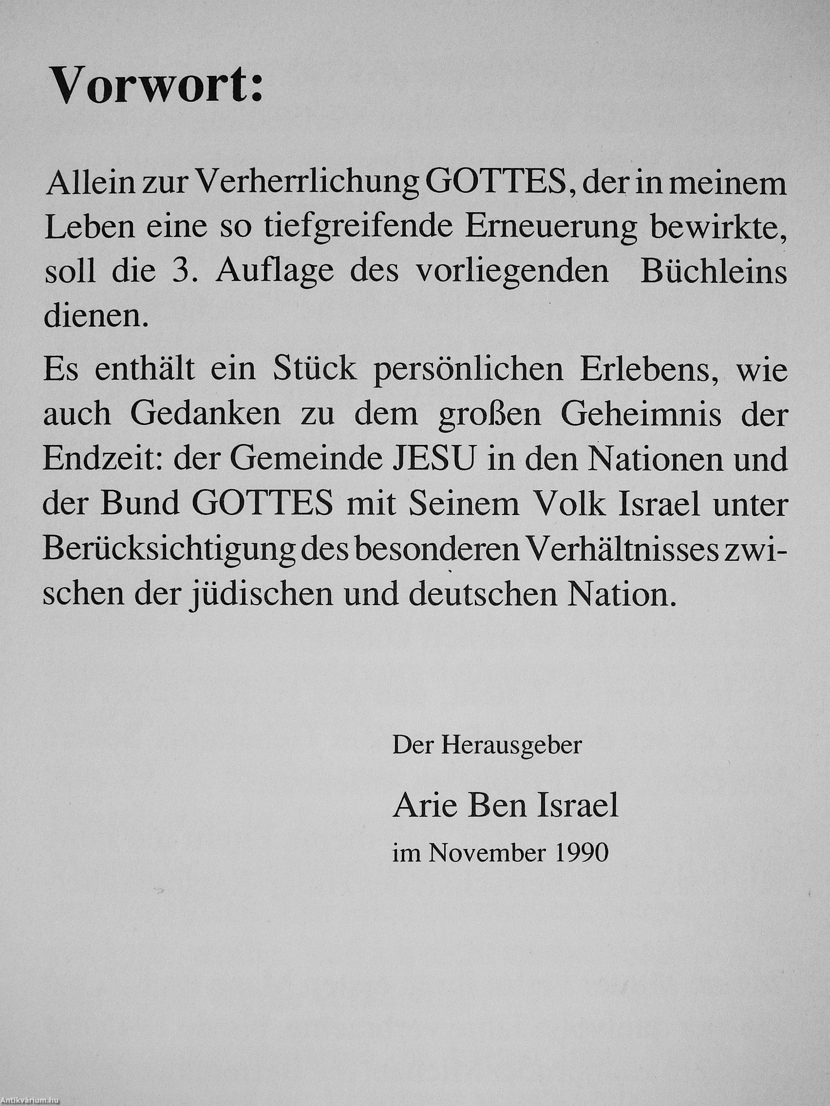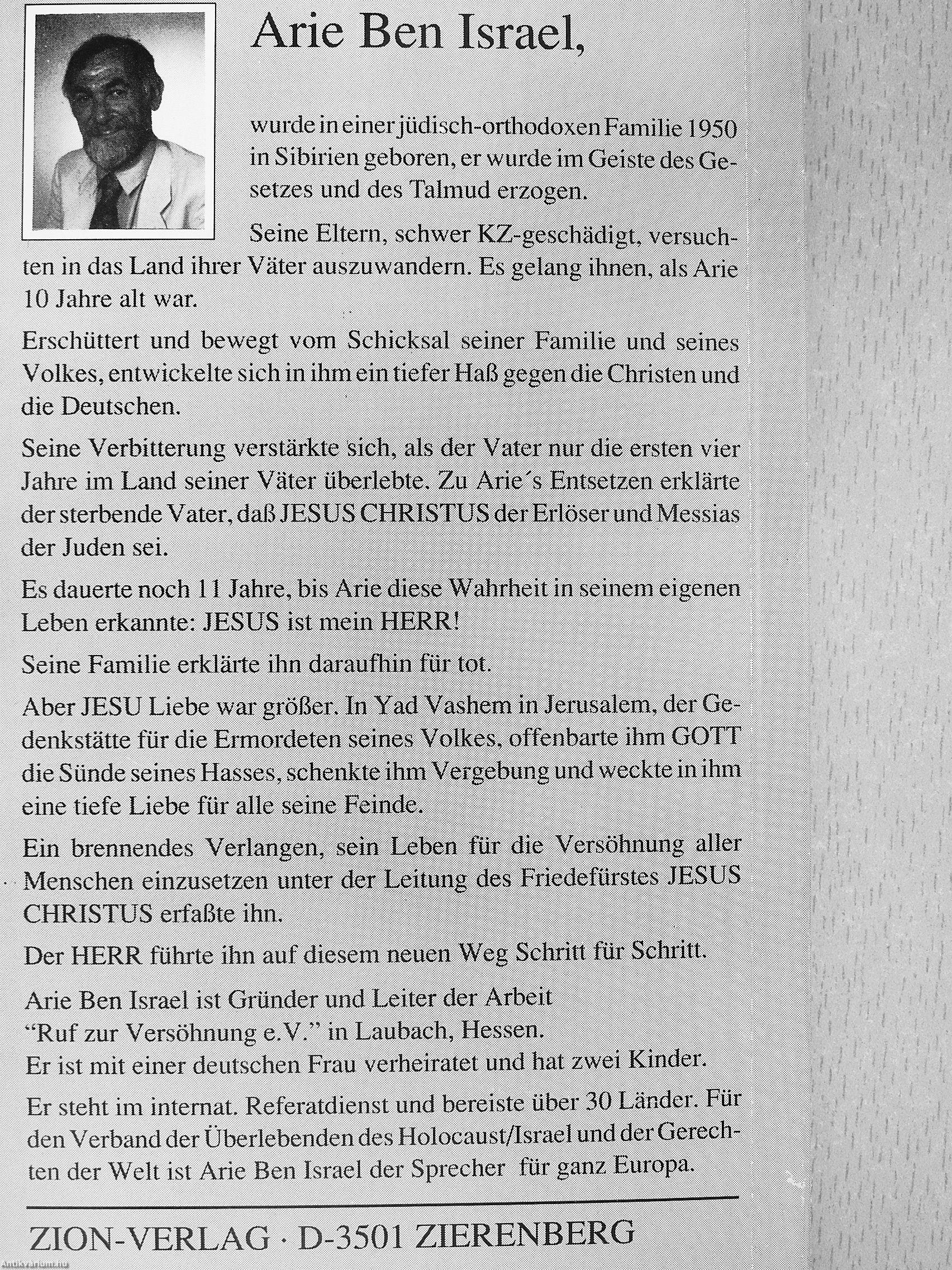 Seine Verbitterung verstärkte sich, als der Vater nur die ersten vier Jahi-e im Land seijier Väter überlebte. Zu Arie's Entsetzen erklärte der sterbende Vater, daß JESUS CHRISTUS der Erlöser und Messia.s der Juden sei.