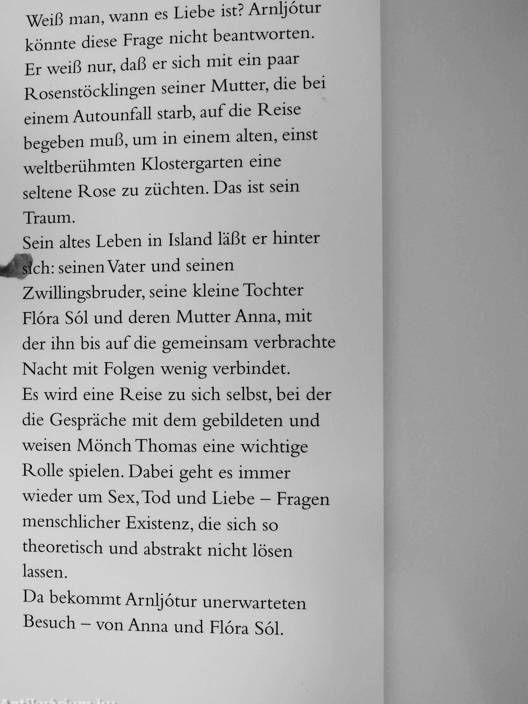 Weiß man, wann es Liebe ist? Arnljótur könnte diese Frage nicht beantworten. Er weiß nur, daß er sich mit ein paar Rosenstöcklingen seiner Mutter, die bei einem Autounfall starb, auf die Reise begeben muß, um in einem alten, einst weltberühmten Klostergarten eine seltene Rose zu züchten. Das ist sein Traum.