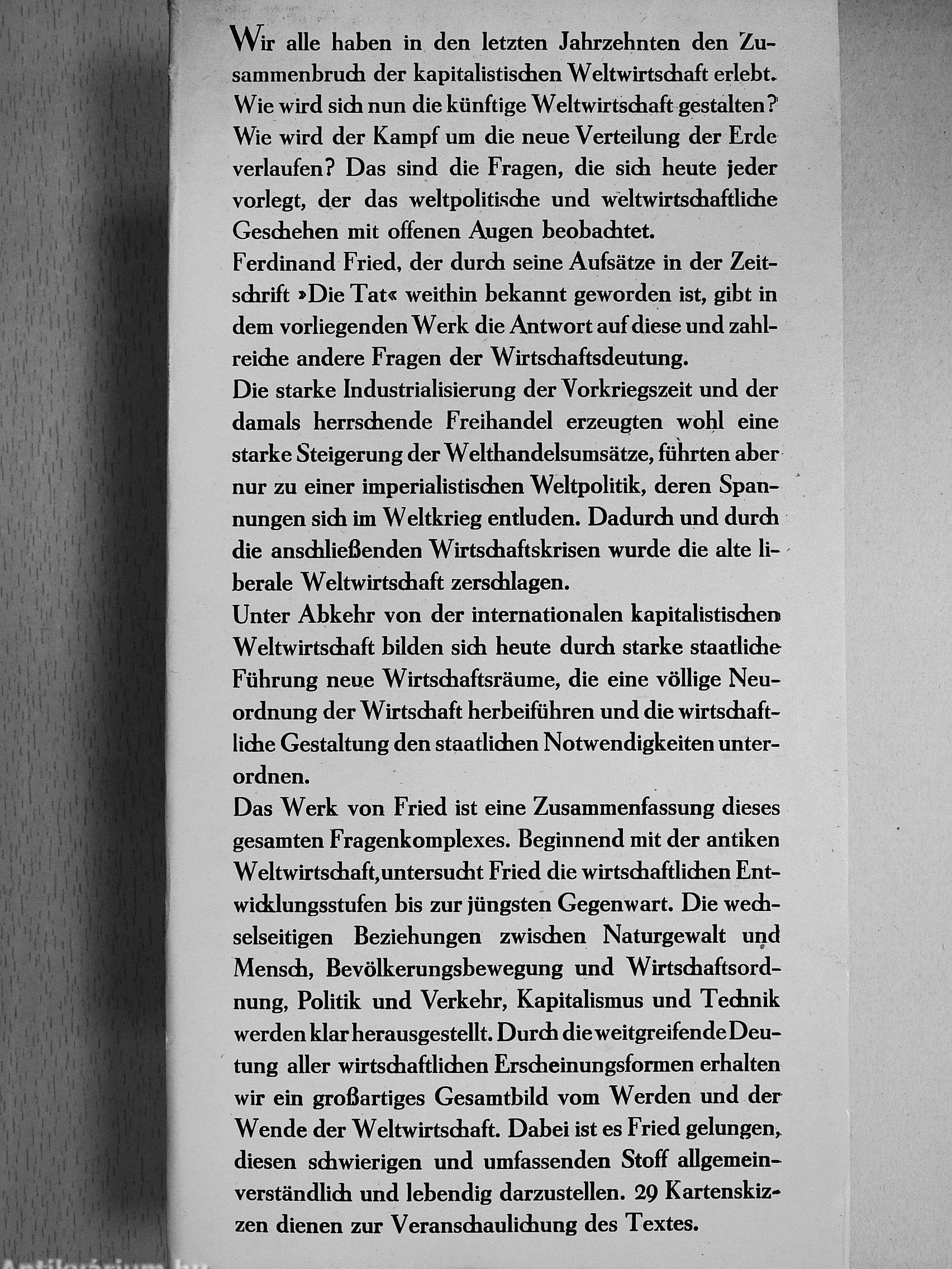 Das Werk von Fried ist eine Zusammenfassung dieses gesamten Fragenkomplexes. Beginnend mit der antiken Weltwirtsdiaft,untersudit Fried die wirtsdiaftlidien Ent-widdungsstufen bis zur jüngsten Gegenwart. Die wedi-selseitigen Beziehungen zwisdien Naturgewalt und Mensdi, Bevölkerungsbewegung und Wirtsdiaftsord-nung, Politik und Verkehr, Kapitalismus und Tedinik werden klar herausgestellt. Durdi die weitgreifende Deutung aller wirtsdiaftlidien Ersdieinungsformen erhalten wir ein großartiges Gesamtbild vom Werden und der Wende der Weltwirtsdiaft. Dabei ist es Fried gelungen^ diesen sdiwierigen und umfassenden Stoff cillgemein-verständlidi und lebendig darzustellen. 29 Kartenskizzen dienen zur Veransdiaulidiung des Textes. Vissza
