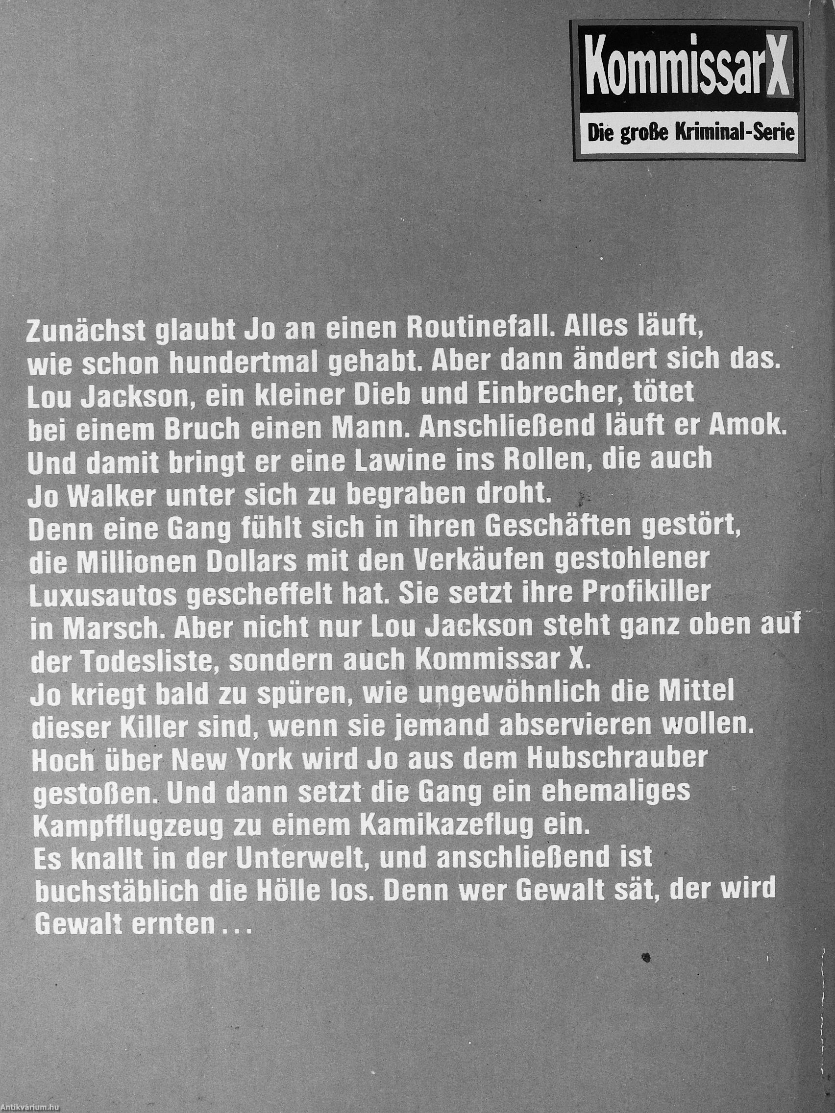 Zunächst glaubt Jo an einen Routinefall. Alles läuft, wie sclion hundertmal gehabt. Aber dann ändert sich das. Lou Jackson, ein kleiner Dieb und Einbrecher, tötet bei einem Bruch einen Mann. Anschließend läuft er Amok. Und damit bringt er eine Lawine Ins Rollen, die auch Jo Walker unter sich zu begraben droht. Denn eine Gang fühlt sich in ihren Geschäften gestört, die Millionen Dollars mit den Verkäufen gestohlener Luxusautos gescheffelt hat. Sie setzt ihre Profikiller in Marsch. Aber nicht nur Lou Jackson steht ganz oben auf der Todesliste, sondern auch Kommissar X. Jo kriegt bald zu spüren, wie ungewöhnlich die Mittel dieser Killer sind, wenn sie jemand abservieren wollen. Hoch über New York wird Jo aus dem Hubschrauber gestoßen. Und dann setzt die Gang ein ehemaliges Kampfflugzeug zu einem Kamikazeflug ein. Es knallt in der Unterwelt, und anschließend ist buchstäblich die Hölle los. Denn wer Gewalt sät, der wird Gewalt ernten