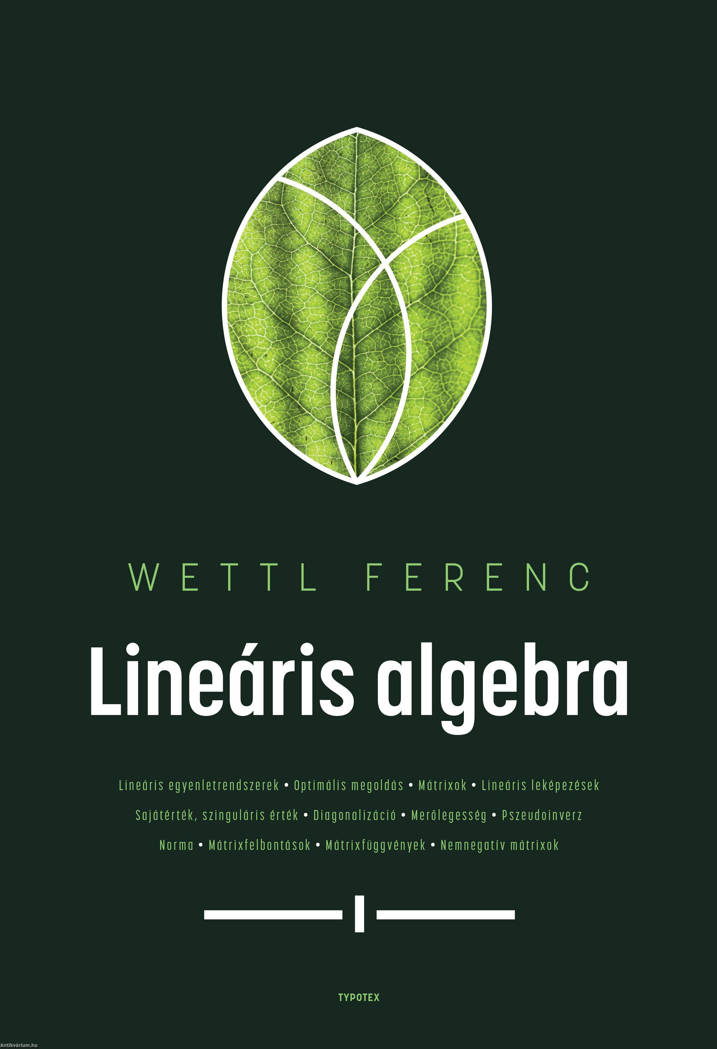 A lineáris algebra az elmúlt időben olyan új és stratégiai fontosságú alkalmazott területeken kapott fontos szerepet, mint a mesterséges intelligencia, a kvantumfizika, a kódelmélet vagy a digitális jelfeldolgozás. Wettl Ferenc műve mérnöki, közgazdasági és természettudományi alap- és mesterszintű kurzusok számára tankönyvként és kiegészítő anyagként is szolgálhat. Az absztrakció szintje ugyanakkor a középiskolai szintről indulva apró lépésekben, fokozatosan emelkedik. A szerzőt az a törekvés vezette, hogy a lineáris algebra fogalmai ne égből pottyant, bár könnyen számolható, de érthetetlen furcsaságok, hanem természetes módon felvetődő kérdésekre adott minél egyszerűbb válaszok legyenek. A kötetbe az utóbbi két évtizedben a nemzetközi tantervek részévé vált fogalmak, például a szinguláris érték, a pszeudoinverz vagy a mátrix kitüntetett alterei is bekerültek. A megértést sok szemléltető ábra és kalkulátorszintű programnyelvi kód segíti.