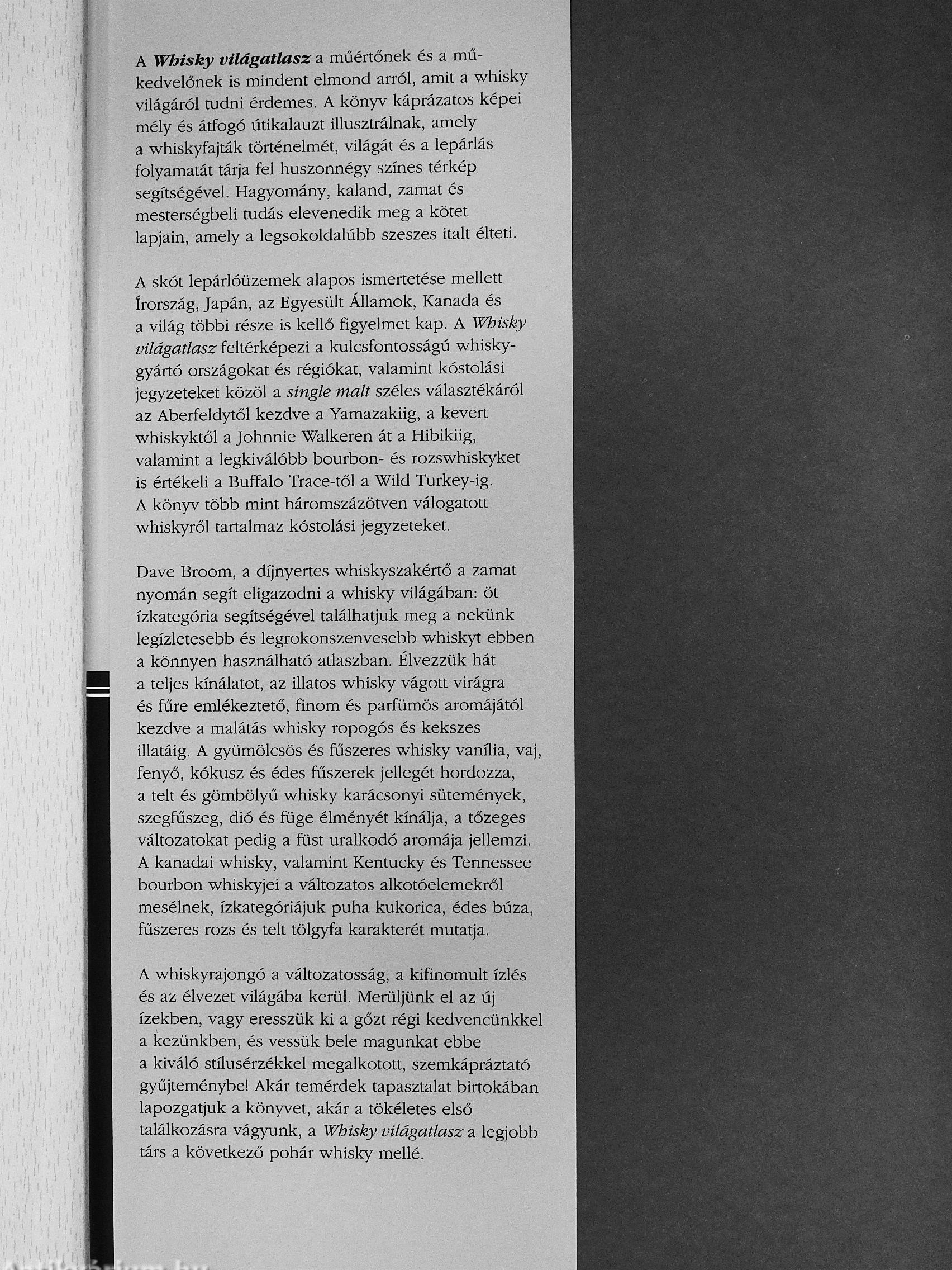 A whiskyrajongó a változatosság, a kifínomuk ízlés és az élvezet világába kerül. Merüljünk el az új ízekben, vagy eresszük ki a gőzt régi kedvencünkkel a kezünkben, és vessük bele magunkat ebbe a kiváló stílusérzékkel megalkotott, szemkápráztató gyűjteménybe! Akár temérdek tapasztalat birtokában lapozgatjuk a könyvet, akár a tökéletes első találkozásra vágyunk, a Whisky világatlasz a legjobb társ a következő pohár whisky mellé.