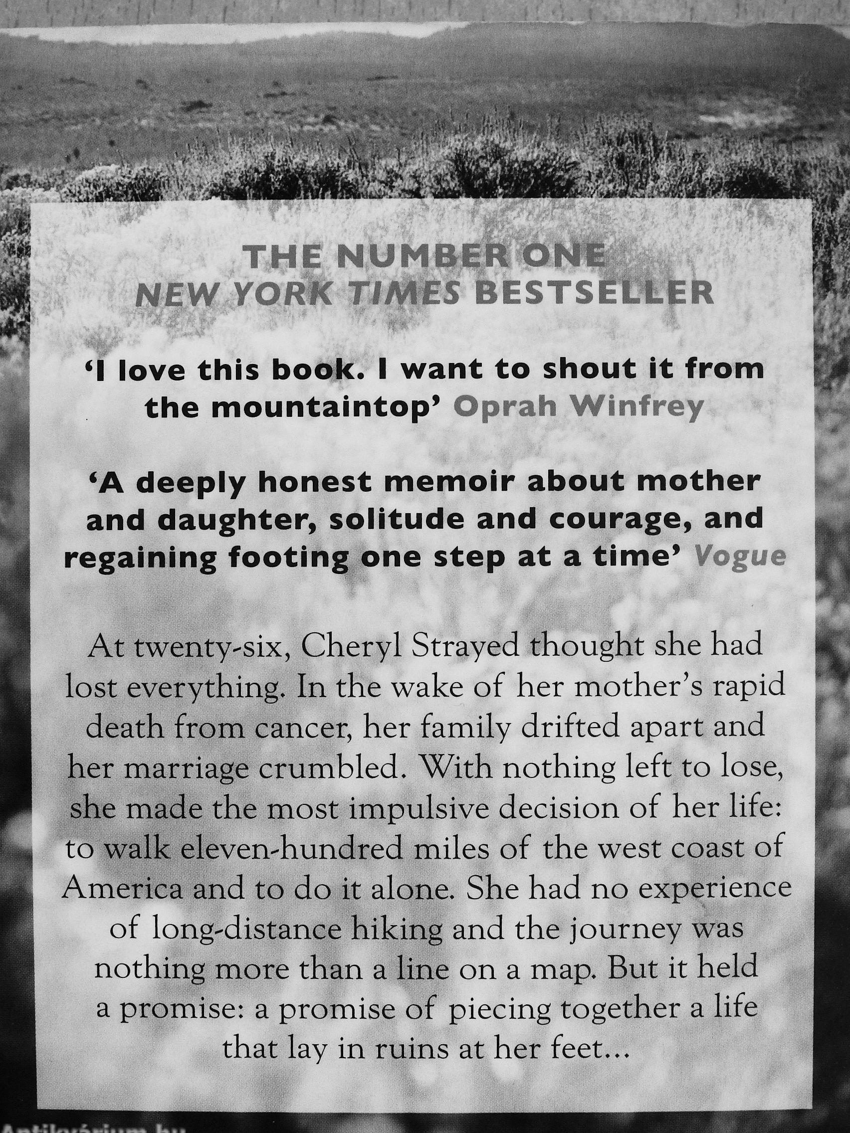death from cancer, her family drifted apart and her marriage crumbled. With nothing left to lose, she made the most impulsive decision of her life: to walk eleven-hundred miles of the west coast of America and to do it alone. She had no experience of long-distance hiking and the journey was nothing more than a line on a map. But it held a promise: a promise of piecing together a life that lay in ruins at her feet