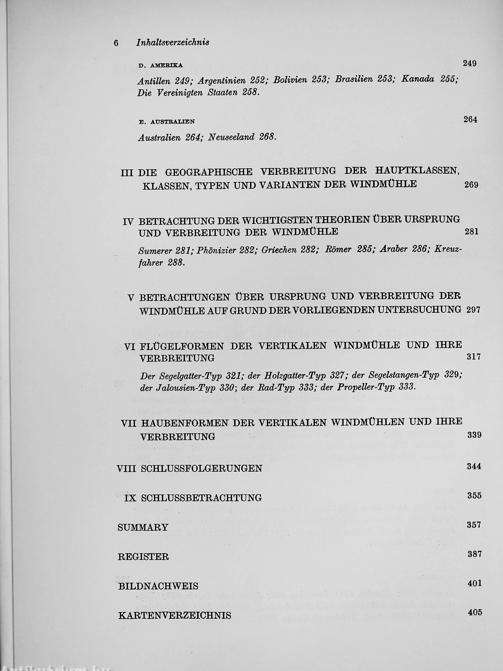 In acht Karten wird versucht, ein Bild der geographischen und der historischen Verbreitung der verschiedenen Windmühlentypen zu geben. Danach und entsprechend den Ergebnissen des Buches muß die Wiege der Windmühle im euroasiatischen Raum gesucht werden, von dem aus ihre Verbreitung nach den übrigen Erdteilen vor sich ging. Schließlich hat der Autor eine Hypothese aufgestellt im Hinblick auf den Ursp^ng der ersten Windmühle. Das Ganze ist abgerundet durch eine Untersuchung der historischen Entwicklung der vertikalen Elügelfor-men. Die Verbreitung der wichtigsten dieser Formen in Europa ist in einer Karte festgelegt. Auch die verschiedenen Haubenformen wurden einer Betrachtung unterzogen. Vissza