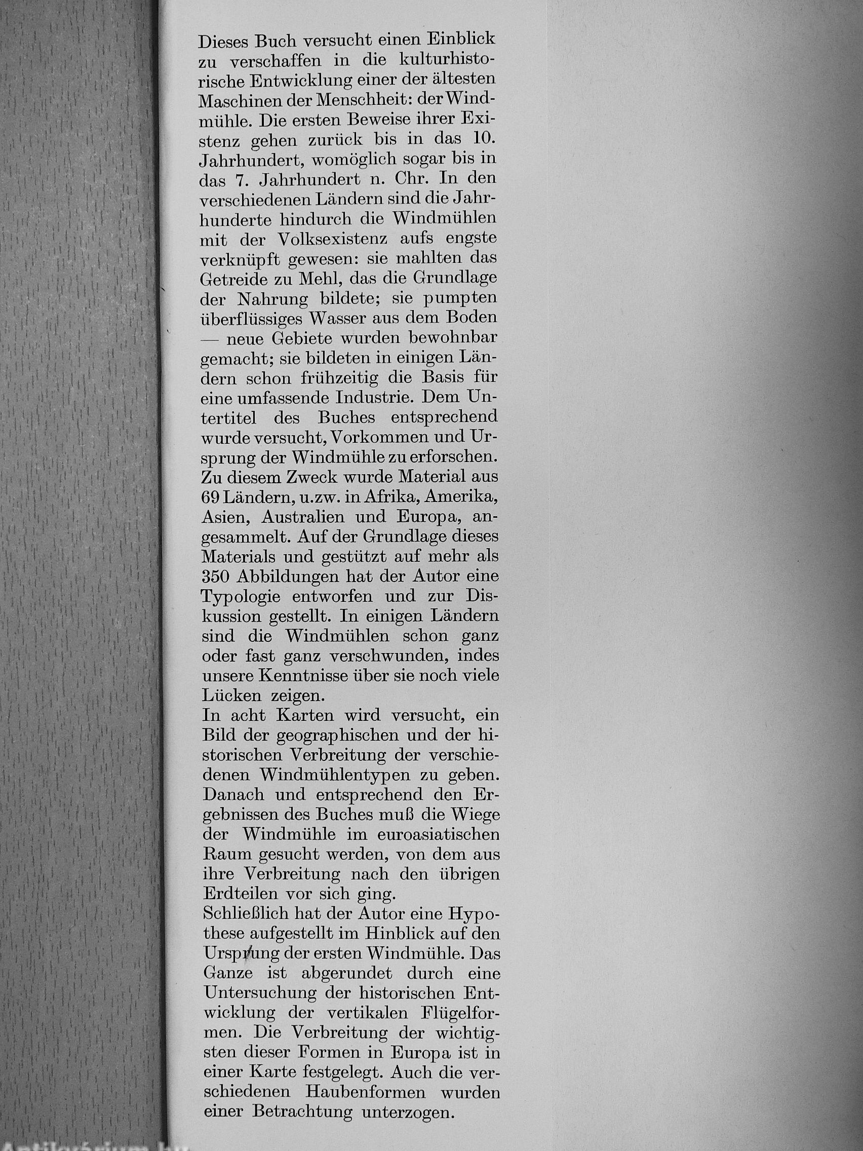Dieses Buch versucht einen Einblicli zu verschaffen in die kulturhistorische Entwicklung einer der ältesten Maschinen der Menschheit: der Windmühle. Die ersten Beweise ihrer Existenz gehen zurück bis in das 10. Jahrhundert, womöghch sogar bis in das 7. Jahrhundert n. Chr. In den verschiedenen Ländern sind die Jahrhunderte hindurch die Windmühlen mit der Volksexistenz aufs engste verknüpft gewesen: sie mahlten das Getreide zu Mehl, das die Grundlage der Nahrung bildete; sie pumpten überflüssiges Wasser aus dem Boden — neue Gebiete wurden bewohnbar gemacht; sie bildeten in einigen Ländern schon frühzeitig die Basis für eine umfassende Industrie. Dem Untertitel des Buches entsprechend wurde versucht. Vorkommen und Ursprung der Windmühle zu erforschen. Zu diesem Zweck wurde Material aus 69 Ländern, u.zw. in Afrika, Amerika, Asien, Australien und Europa, angesammelt. Auf der Grundlage dieses Materials und gestützt auf mehr als 350 Abbildungen hat der Autor eine Typologie entworfen und zur Diskussion gestellt. In einigen Ländern sind die Windmühlen schon ganz oder fast ganz verschwunden, indes unsere Kenntnisse über sie noch viele Lücken zeigen.