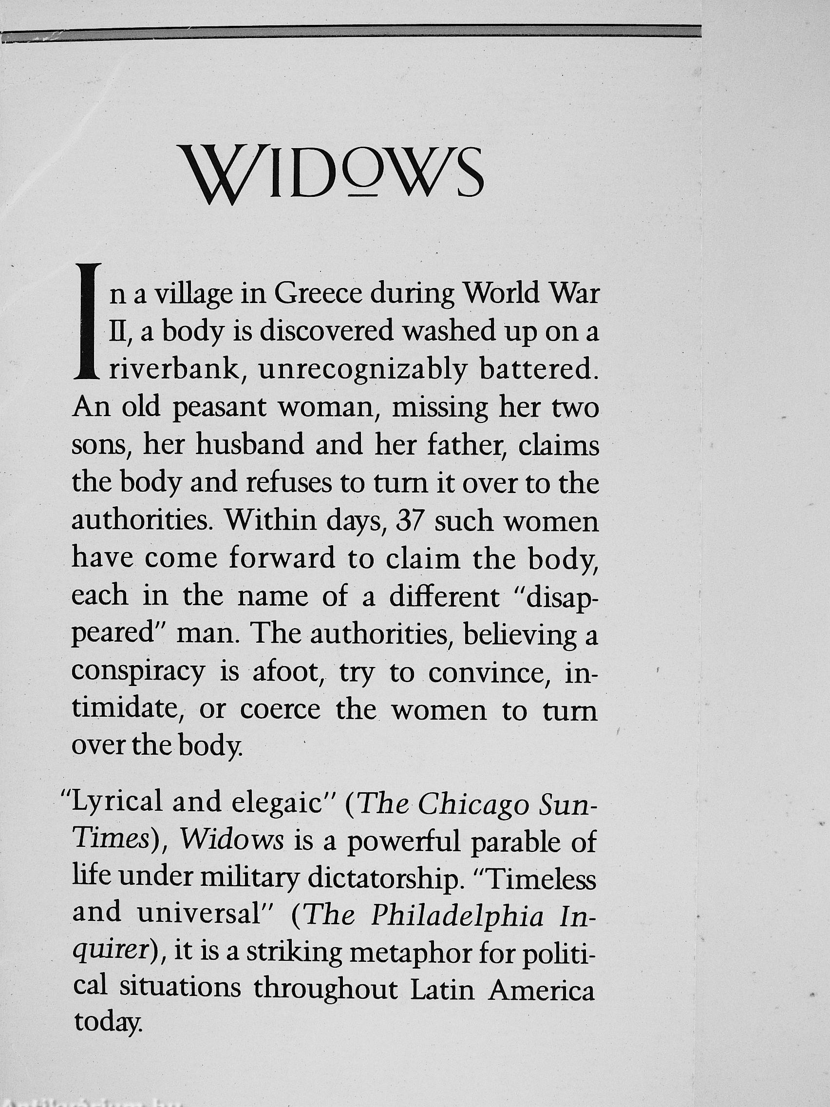 "Lyrical and elegaic" (The Chicago Sun-Times), Widows is a powerful parable of life under military dictatorship. "Timeless and universal" (The Philadelphia Inquirer), it is a striking metaphor for political situations throughout Latin America today Vissza