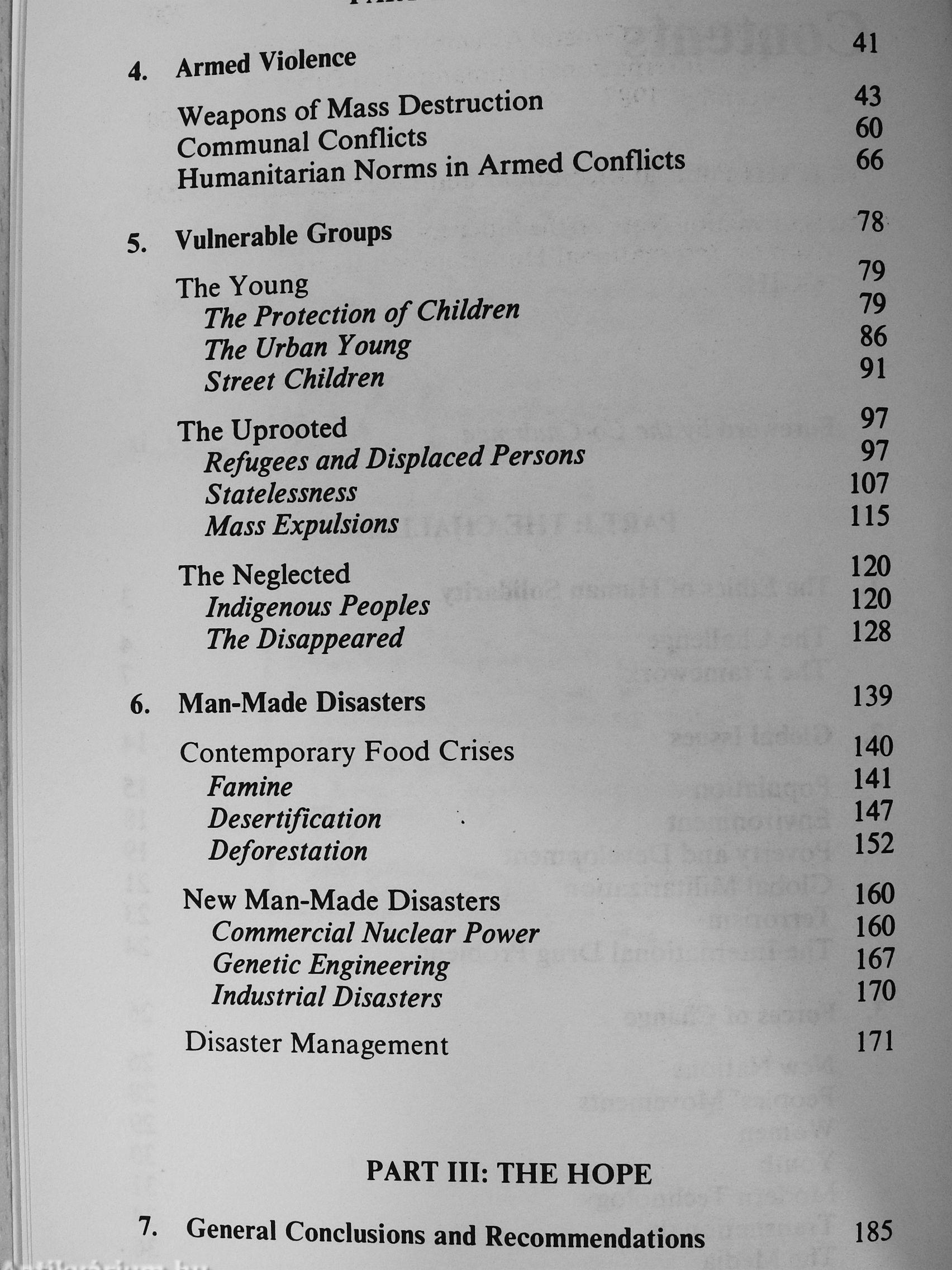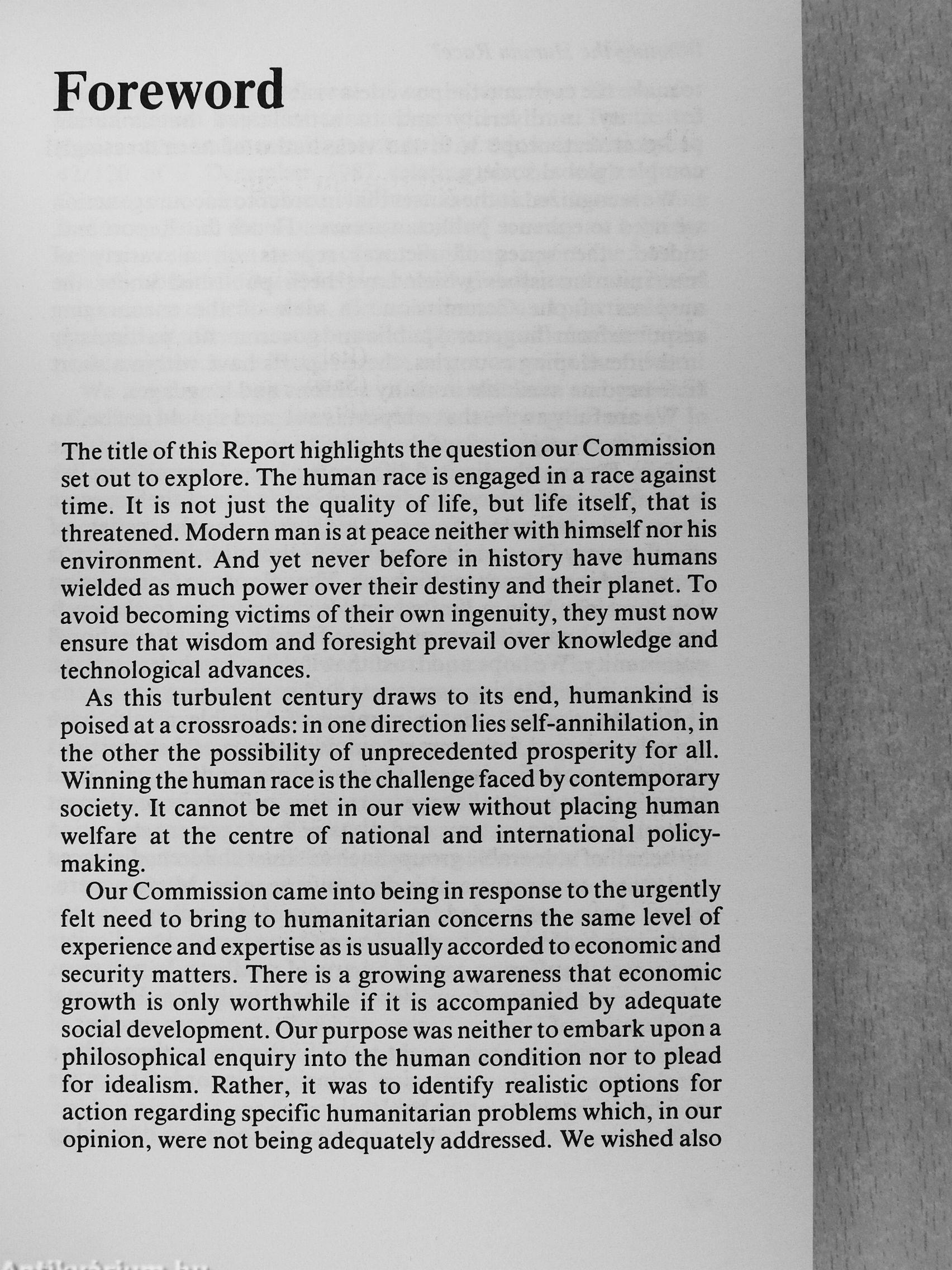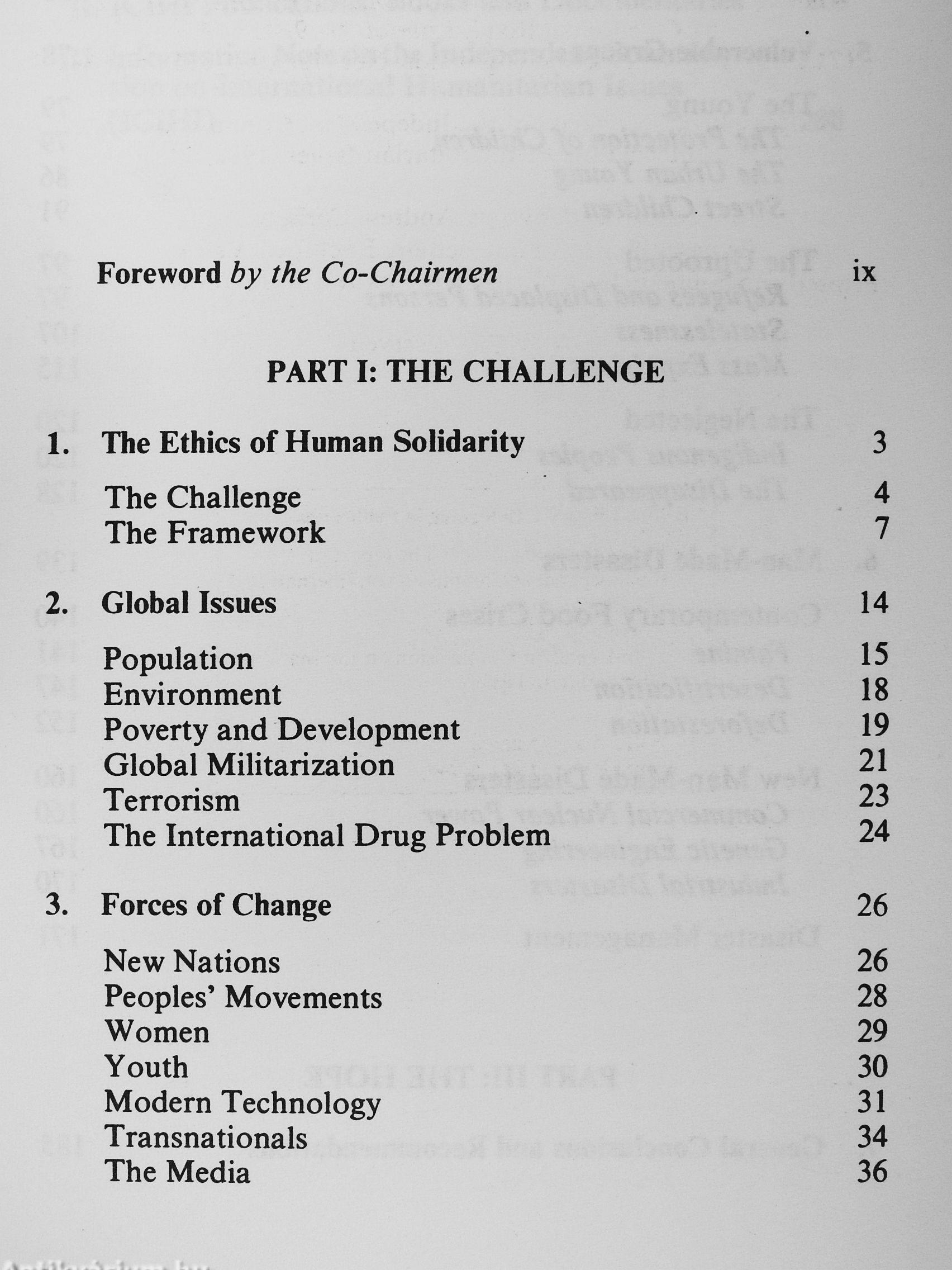 This compelling Report by a group of eminent persons from 29 countries representing all regions of the world, is not just another appeal to compassion and conscience. It is a call for realistic and timely action hy Governments and individuals alike to rise to the great humanitarian challenges of our time.