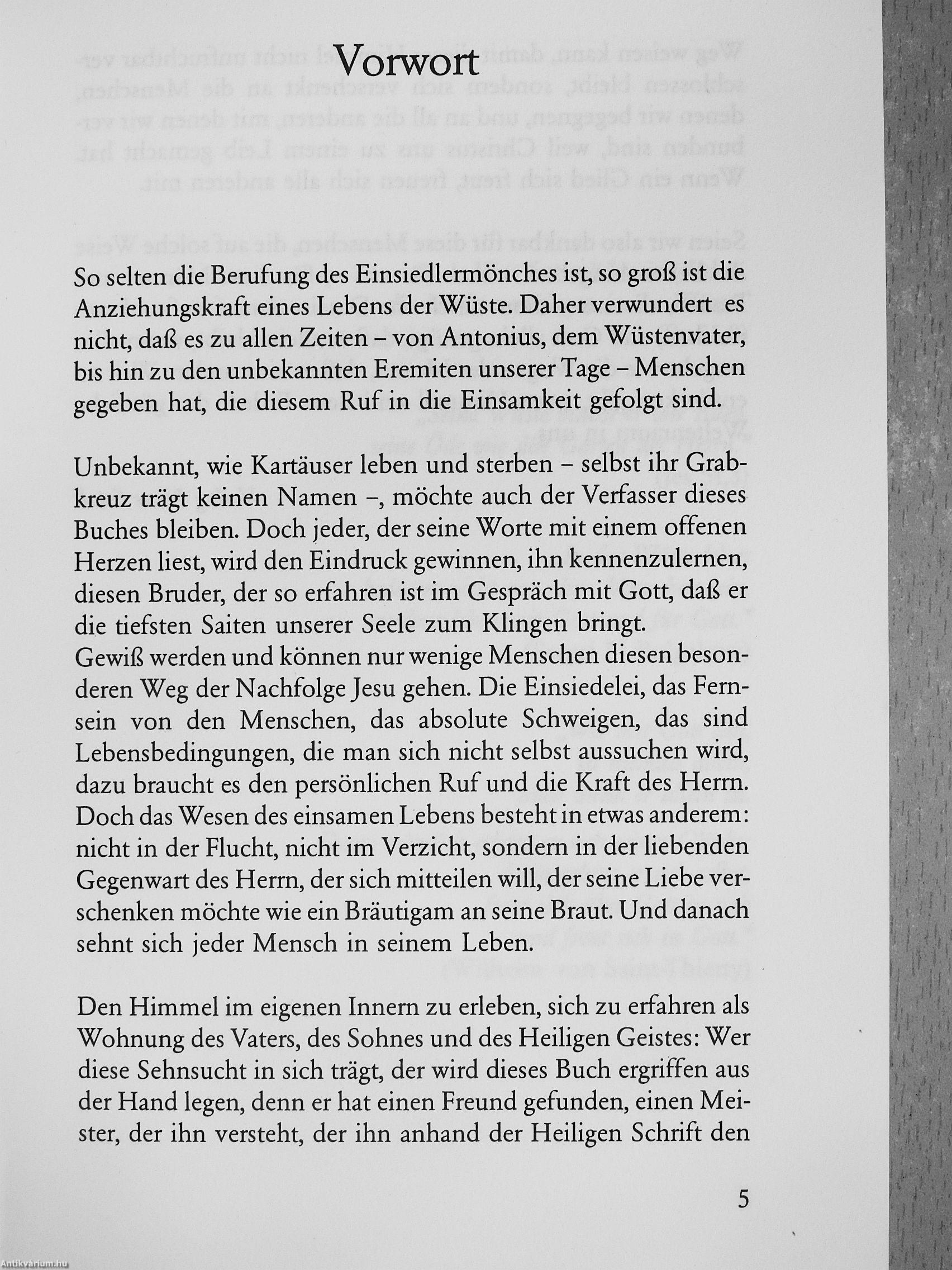 „Das Glaubenszeugnis eines Einsiedlers triflft: auf eine ,Marktlücke'. Wüste, Gebirge, Tempel und Zelle sind dem Autor nicht nur aus biblisclier Sicht wichtig als Orte der Gottesbegegnung, sie werden für ihn zu Stätten, da Gott in sein Leben einbricht. Jedes Wort ist aus einer Glaubensgewißheit geschrieben, die ansteckend, wirkt auf Menschen, denen der Zweifel am Sinn zum tauchen Wegbegleiter geworden ist. Die kindliche und doch biblisch geprägte Frömmi gkeit, der Verzicht auf jeden Absolutheitsanspruch und den erhobenen Zeigefinger lassen die Lektüre zu einem geistlichen Erlebnis werden."