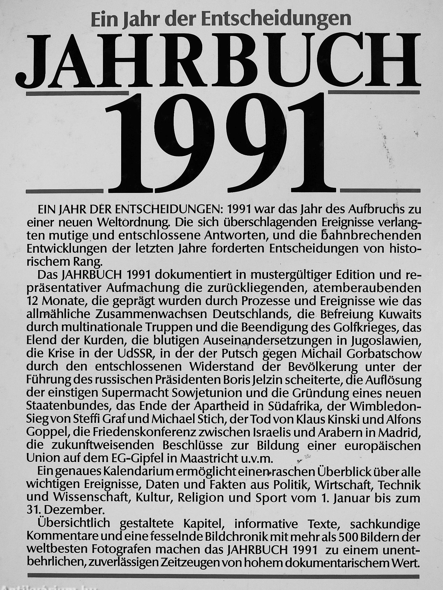 Das JAHRBUCH 1991 dokumentiert in mustergültiger Edition und repräsentativer Aufmachung die zurückliegenden, atemberaubenden 12 Monate, die geprägt wurden durch Prozesse und Ereignisse wie das allniähliche Zusammenwachsen Deutschlands, die Befreiung Kuwaits durch multinationale Truppen und die Beendigung des Golfkrieges, das Elend der Kurden, die blutigen Auseinandersetzungen in Jugoslawien, die Krise in der UdSSR, in der der Putsch gegen Michail Gorbatschow durch den entschlossenen Widerstand der Bevölkerung unter der Führung des russischen Präsidenten Boris Jelzin scheiterte, die Auflösung der einstigen Supermacht Sowjetunion und die Gründung eines neuen Staatenbundes, das Ende der Apartheid in Südafrika, der Wimbledon-Siegvon Steffi Graf und Michael Stich, der Tod von Klaus Kinski und Alfons Goppel, die Friedenskonferenz zwischen Israelis und Arabern in Madrid, die zukunftweisenden Beschlüsse zur Bildung einer europäischen Union auf dem EG-Gipfel in Maastricht u.v.m.