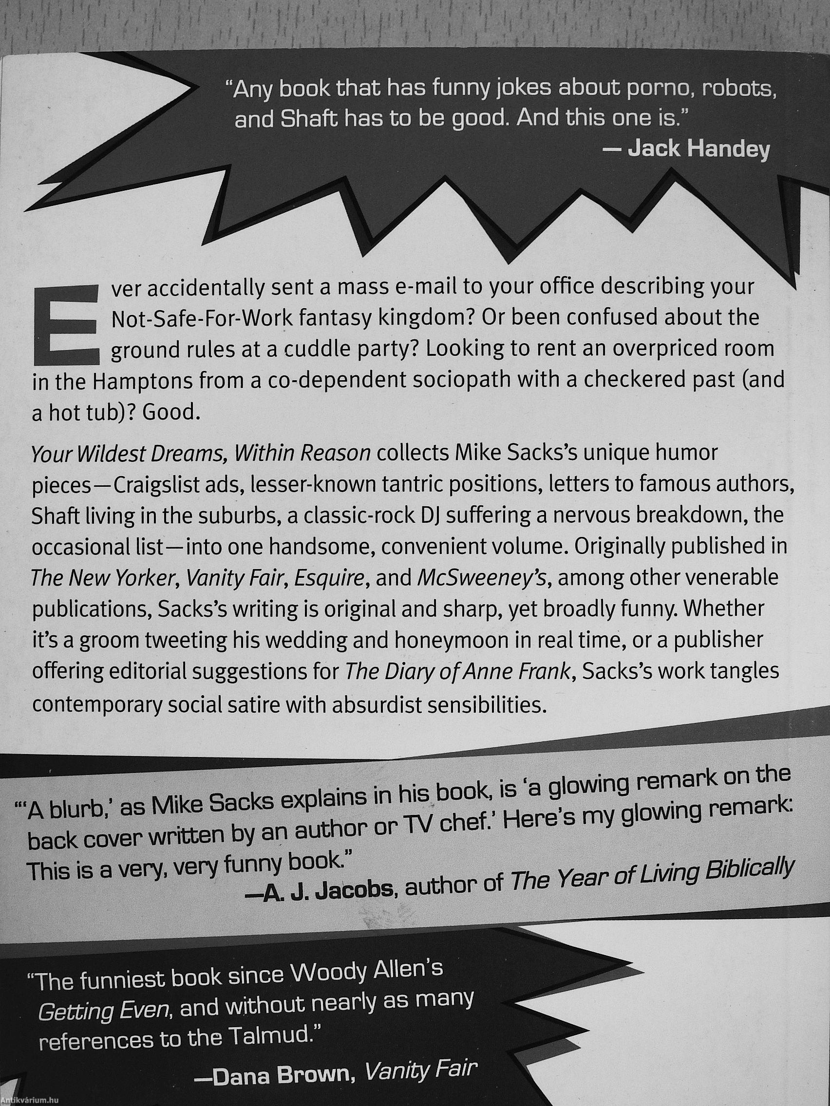 Your Wildest Dreams, Within Reason collects Mike Sacks's unique humor pieces-Craigslist ads, lesser-known tantric positions, letters to famous authors, Shaft living in the suburbs, a classic-rock Dj suffering a nervous breakdown, the occasional list—into one handsome, convenient volume. Originally published in The New Yorker, Vanity Fair, Esquire, and McSweeney's, among other venerable publications, Sacks's writing is original and sharp, yet broadly funny. Whether it's a groom tweeting his wedding and honeymoon in real time, or a publisher offering editorial suggestions for The Diary of Anne Frank, Sacks's work tangles contemporary social satire with absurdist sensibilities.
