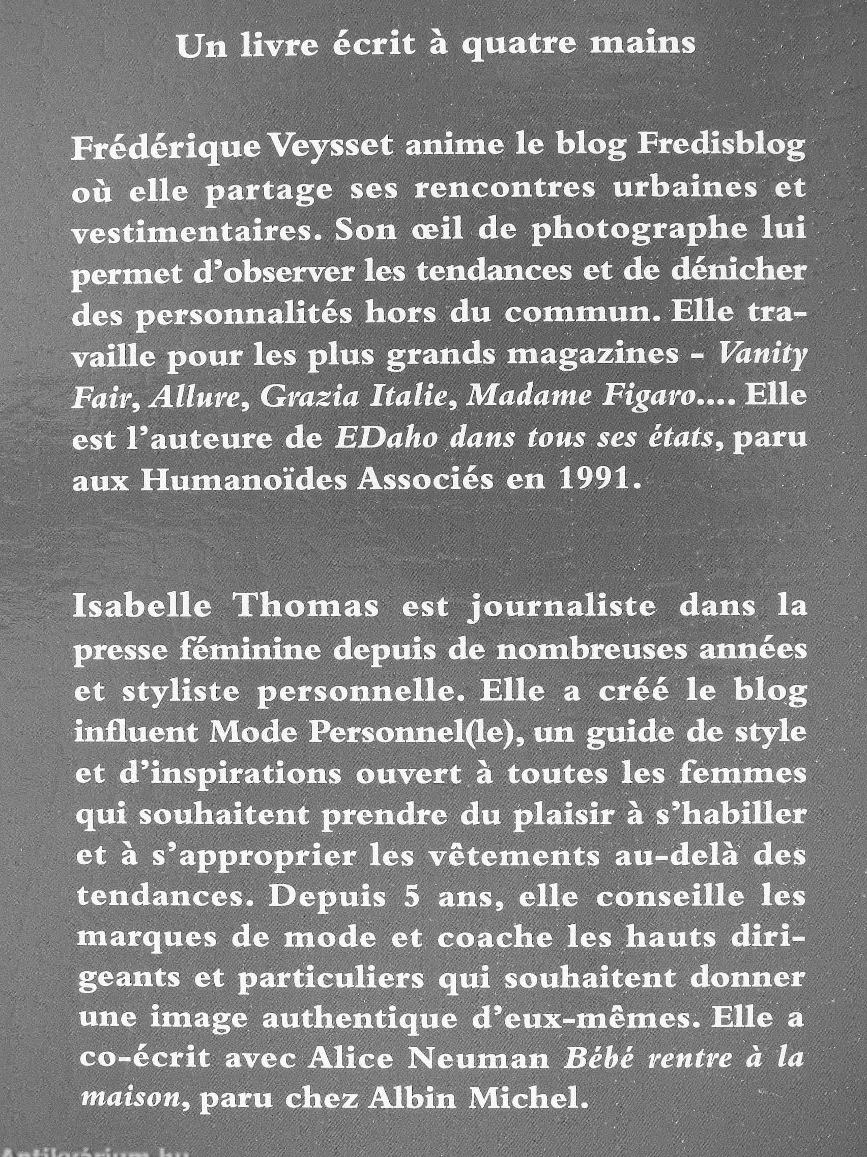 Frédérique Veysset anime le blog Fredisblog ou elle partage ses rencontres urbaines et vestimentaires. Son oil de photographe lui permet d'observer les tendances et de dénicher des personnalités hors du commun. Elle travaille pour les plus grands magazines - Vanity Fair, Allure, Grazia Italie, Madame Figaro , File est Tauteure de EDaho dans tous ses états, paru aux Humanoides Associés en 1991.