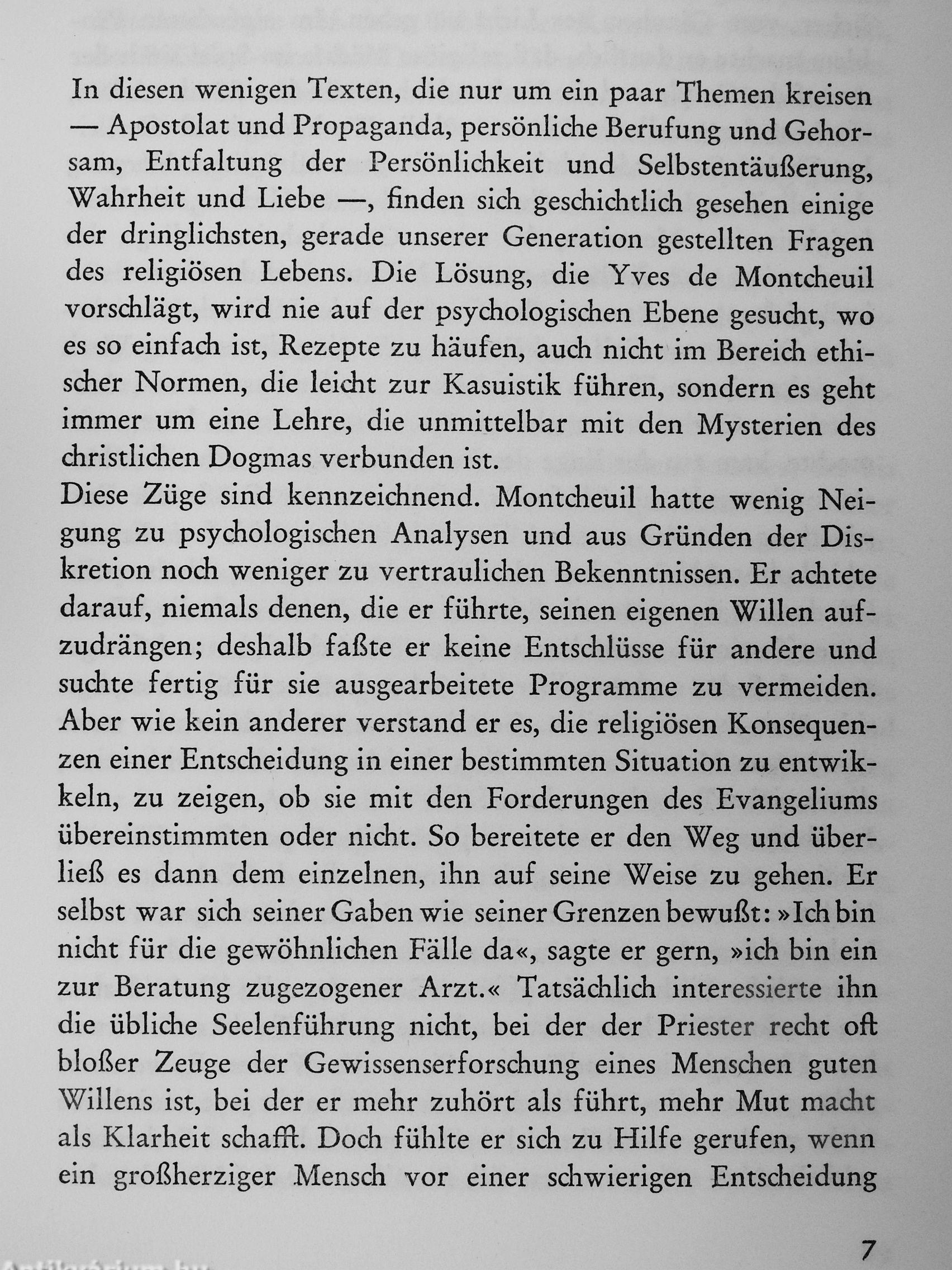 Wenige Männer haben die französische Theologie der Kriegs- und Nachkriegszeit so nachhaltig geprägt wie Montcheuil, und wenige Lehrer haben, nach den Worten René d'Ouinces, auf ihre Schüler einen so entscheidenden Einfluß gehabt wie dieser Jesuit, den die Franzosen ihren »Pater Delp« nennen. Seine gesammelten Schriften und thematischen Abhandlungen erreichten und erreichen hohe Auflagen. Die hier vorgelegte Sammlung wurde nach dem revidierten französischen Original von 1959 neu übersetzt und enthält nur wenige, aber zentrale Aufsätze zu Problemen des religiösen Lebens, deren Lösung Montcheuil nie auf psychologischer Ebene und im Bereich ethisdier Formen allein gesucht hat. Kasuistik, die sich um die Grenze des Erlaubten und Verbotenen müht, interessierte ihn nicht. Ihm ging es einzig darum, darzulegen, was die Liebe fordert. Seine Gedanken zeugen von seiner hohen, auch heute noch gültigen Spiritualität.