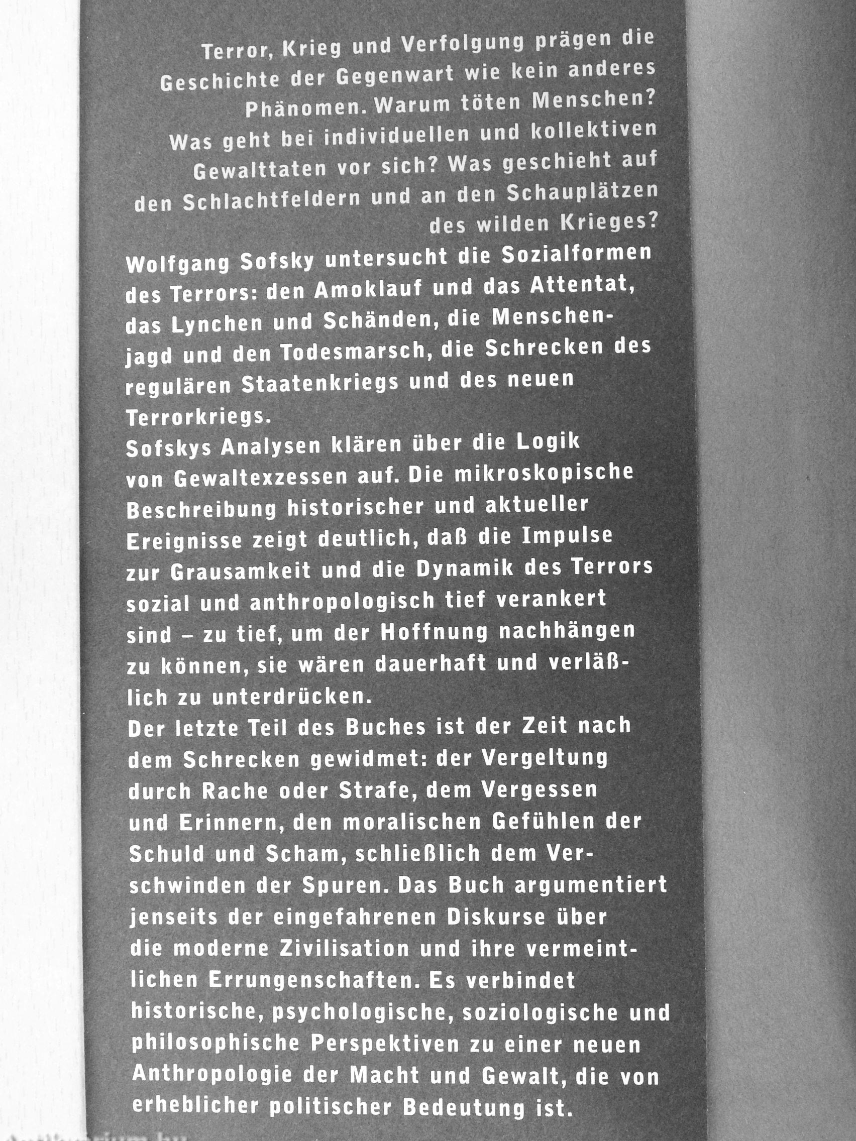 des wilden Krieges? Wolfgang Sofsky untersucht die Sozialformen des Terrors: den Amoklauf und das Attentat, das Lynchen und Schänden, die Menschenjagd und den Todesmarsch, die Schrecken des regulären Staatenkriegs und des neuen Terrorkriegs.