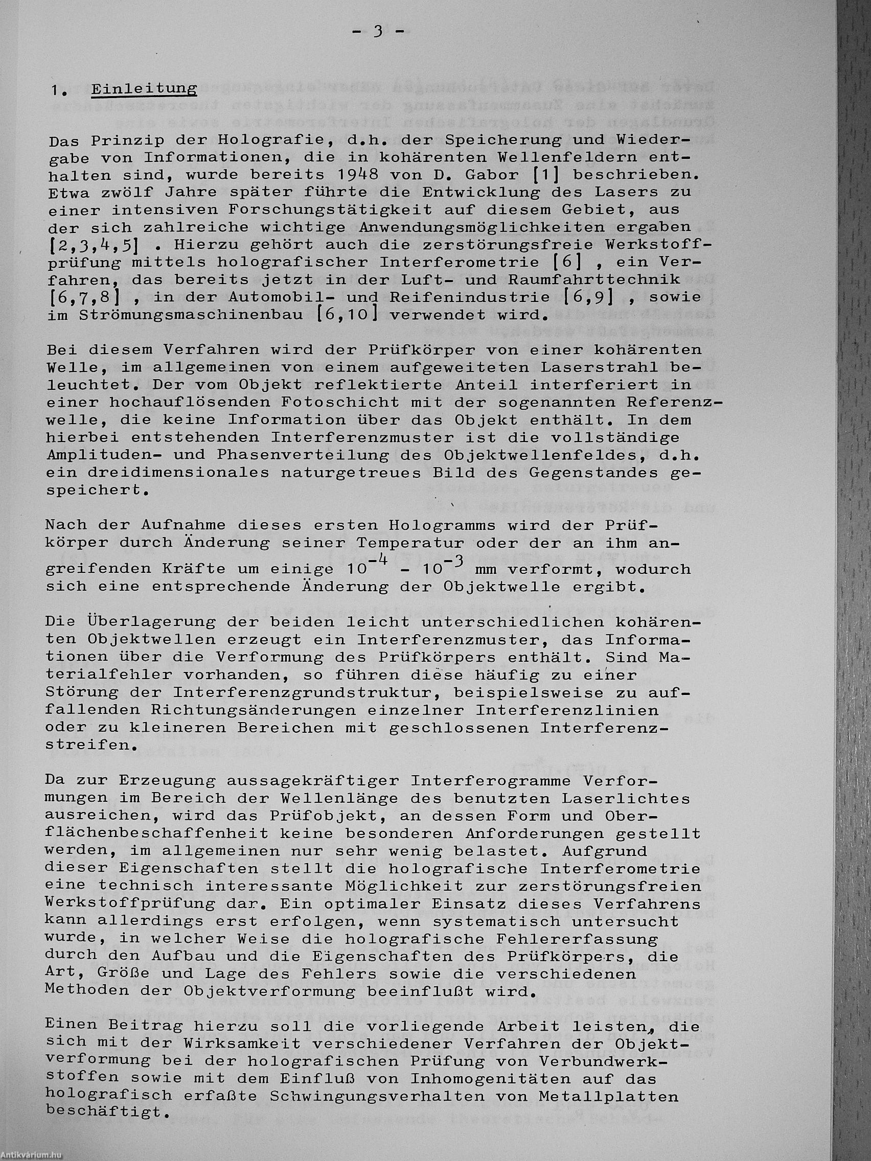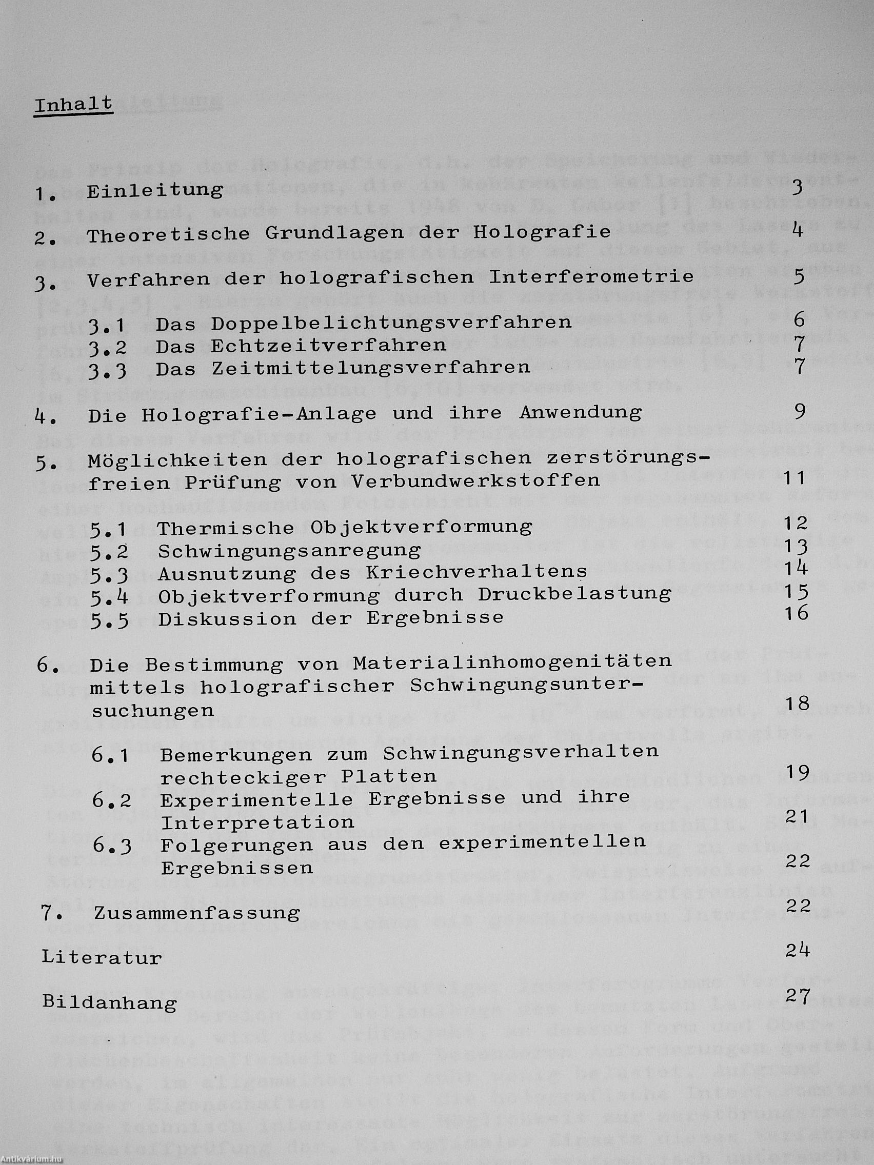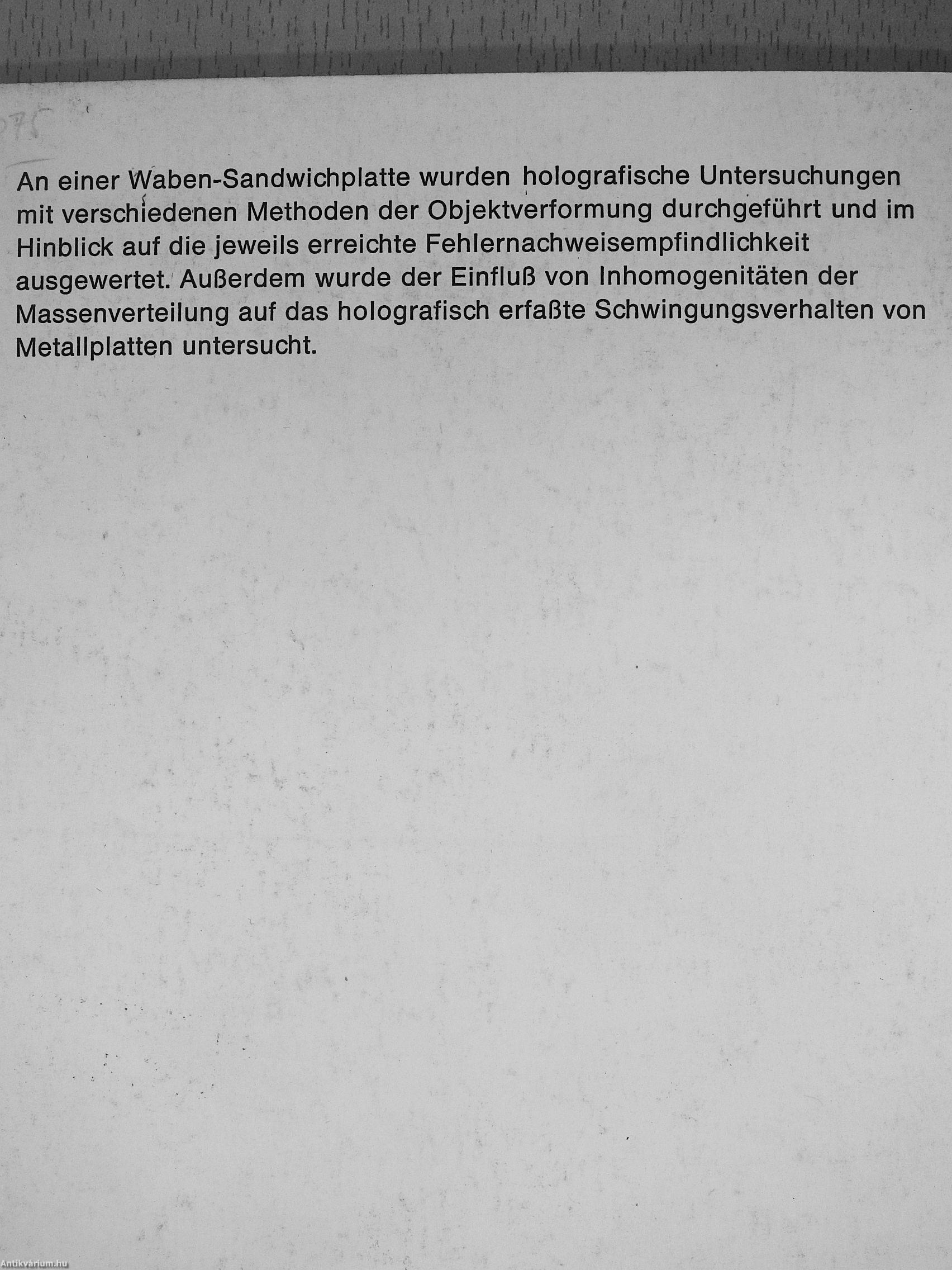 An einer Waben-Sandwichplatte wurden holografiscfie Untersuciiungen mit verschiedenen IVIethoden der Objektverformung durchgeführt und im Hinblick auf die jeweils erreichte Fehlernachweisempfindlichkeit ausgewertet/Außerdem wurde der Einfluß von Inhomogenitäten der Massenverteilung auf das holografisch erfaßte Schwingungsverhalten von Metallplatten untersucht.