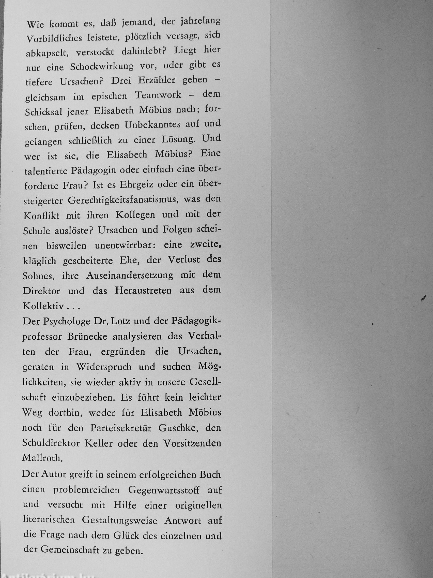 Wie kommt es, daß jemand, der jahrelang Vorbildliches leistete, plötzlich versagt, sich abkapselt, verstockt dahinlebt? Liegt hier nur eine Schockwirkung vor, oder gibt es tiefere Ursachen? Drei Erzähler gehen -gleichsam im epischen Teamwork - dem Schicksal jener Elisabeth Möbius nach; forschen, prüfen, decken Unbekanntes auf und gelangen schließlich zu einer Lösung. Und wer ist sie, die Elisabeth Möbius? Eine talentierte Pädagogin oder einfach eine überforderte Frau? Ist es Ehrgeiz oder ein übersteigerter Gerechtigkeitsfanatismus, was den Konflikt mit ihren Kollegen und mit der Schule auslöste? Ursachen und Folgen scheinen bisweilen unentwirrbar: eine zweite, kläglich gescheiterte Ehe, der Verlust des Sohnes, ihre Auseinandersetzung mit dem Direktor und das Heraustreten aus dem Kollektiv .
