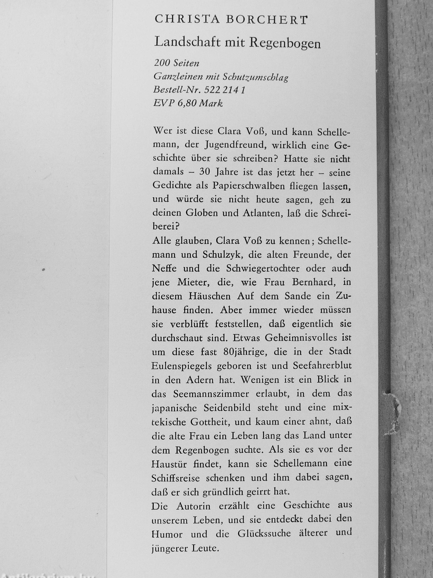 Alle glauben, Clara Voß zu kennen; Schelle-mann und Schulzyk, die alten Freunde, der Neffe und die Schwiegertochter oder aucli jene Mieter, die, wie Frau Bernhard, in diesem Häuschen Auf dem Sande ein Zuhause finden. Aber immer wieder müssen sie verblüfft feststellen, daß eigentlich sie durchschaut sind. Etwas Geheimnisvolles ist um diese fast 80jährige, die in der Stadt Eulenspiegels geboren ist und Seefahrerblut in den Adern hat. Wenigen ist ein Blick in das Seemannszimmer erlaubt, in dem das japanische Seidenbild steht und eine mix-tekische Gottheit, und kaum einer ahnt, daß die alte Frau ein Leben lang das Land unter dem Regenbogen suchte. Als sie es vor der Haustür findet, kann sie Schellemann eine Schiffsreise schenken und ihm dabei sagen, daß er sich gründlich geirrt hat. Die Autorin erzählt eine Geschichte aus unserem Leben, und sie entdeckt dabei den Humor und die Glückssuche älterer und jüngerer Leute.