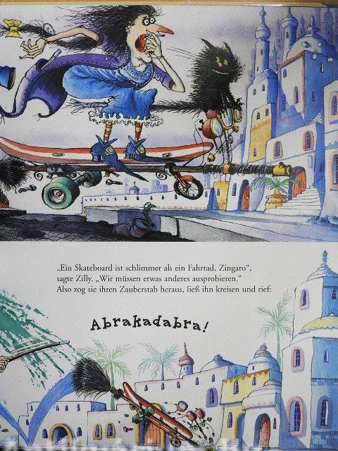 Leider ist estam l^iri^el ziemlich voll geworden -und gefährlich noch dazu.^eim Zusammenstoß mit einem Hubschrauber hat Kater Zingaro sogar ein paar Schnurrbarthaare verloren! Zilly verzaubert'^hren Besen in ein Fahrrad. Aber auch Radfahren ist nicht ungefährlich. Ob ein Skateboard oder ein Pferd sicherer sind?