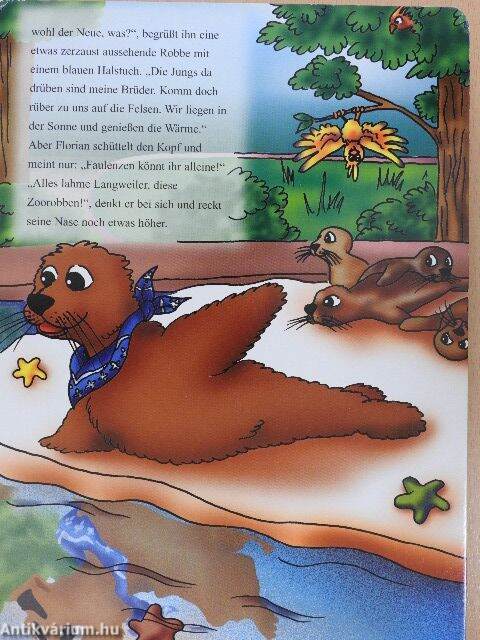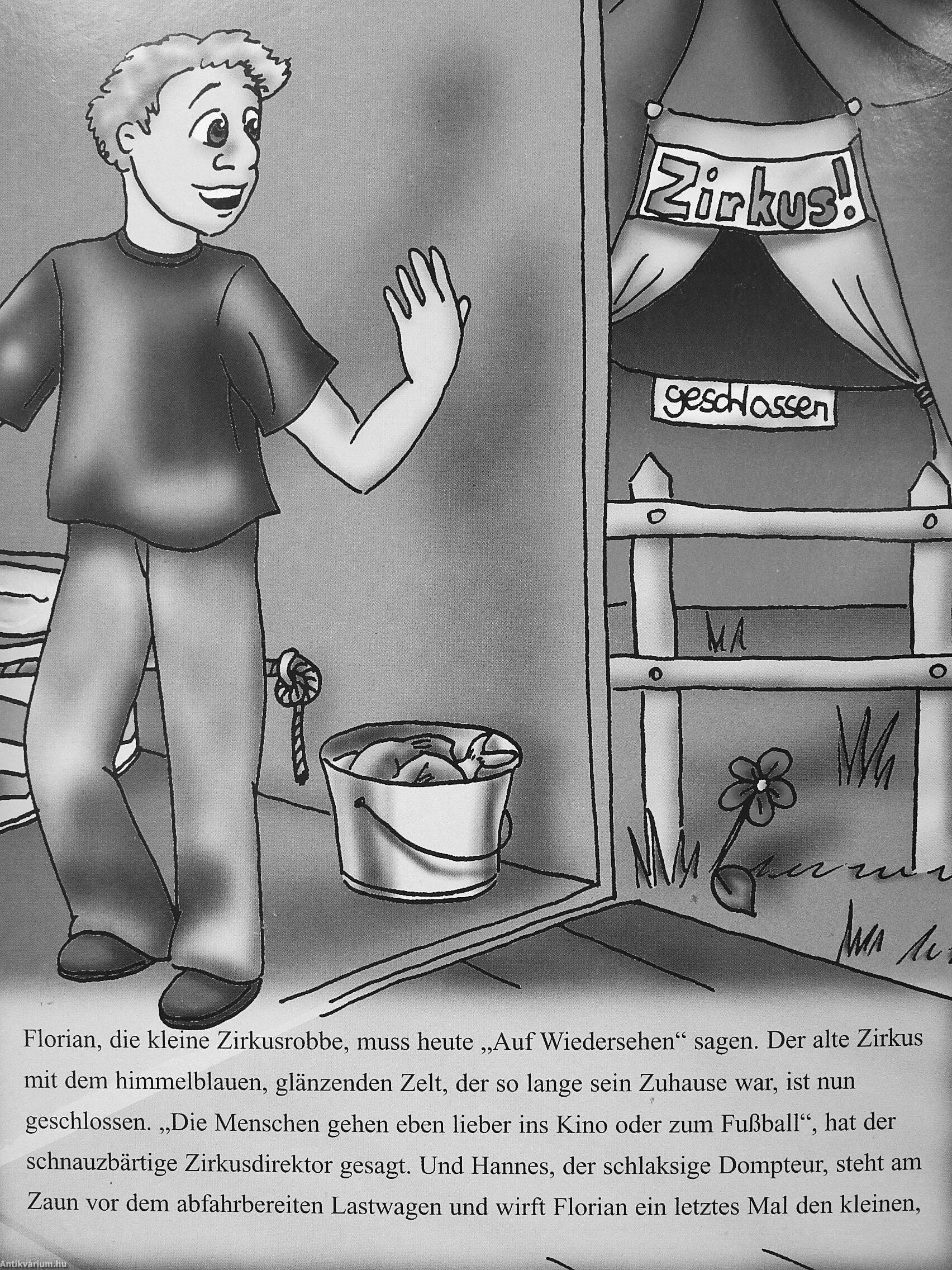 Floriah. die kleine Zirkusrobbe, balanciert am liebsten kleine, bunte l^älle auf der Nasenspitze. Poch nun muss er "Auf Wiedersehen" sagen. Per alte Zirkus mit dem himmelblauen, glänzenden Zelt der so lange sein Zuhause war. wird geschlossen. Per Zoo soll seine neue Heimat werden. Ob er wohl bald neue Freunde findet ?