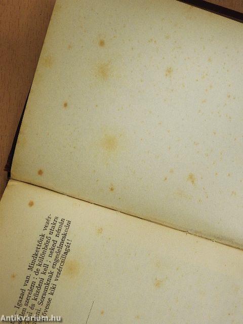 A borító kopott és foltos. A lapélek és néhány oldal foltosak. Az előlapon tulajdonosi bejegyzés látható.
